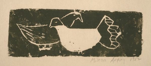 Curator: Immediately, I see a sense of calm, even stillness, radiating from this monochromatic image. Editor: Let’s dive in. The artwork you’re responding to is a woodcut entitled “Two Birds” by Milton Avery, created in 1952. Curator: Woodcut, of course, accounts for that beautiful textural contrast, that gritty interface between black and white. Do you think that choice speaks to a deliberate intention, setting the tone? Editor: Without a doubt. Avery’s approach to materials consistently reflects a desire to pare down and reveal the essence of a subject through simplification. Look closely at the surface: it’s not about polish; it's about process. You see the mark-making and understand the directness. This subtractive method involved physically carving away material from a block, demanding bold choices about positive and negative space. Curator: The birds themselves are simplified forms, nearly archetypes, almost hieroglyphic. Is this meant to tap into collective memory, the idea of birds representing freedom or a connection to nature, or even the soul in flight? Editor: Perhaps, and given its status as an 'artists proof' we could assume Avery was pursuing this purity of form with exacting, yet explorative effort. Notice how the white spaces carve out the birds against the darker background, reversing our expectations? I read it as an interest in pure, unadorned symbolic communication. It's both primal and modern at once. Avery was working during a period fascinated by simplifying to abstraction, finding resonance between raw materials and reduced forms. Curator: Right, and while materially grounded in this woodcut, Avery creates a feeling that extends beyond the purely representational, leading me towards that feeling of meditative quiet from the beginning. Editor: Yes, Avery seemed dedicated to uncovering something timeless with economical means. "Two Birds", in its black and white starkness, gives us so much to consider around both representation and material engagement. Curator: I find that contemplation equally balanced between form and feeling, allowing Avery to speak across generations.