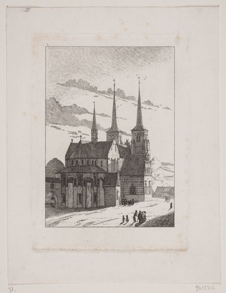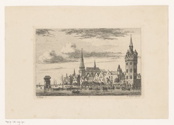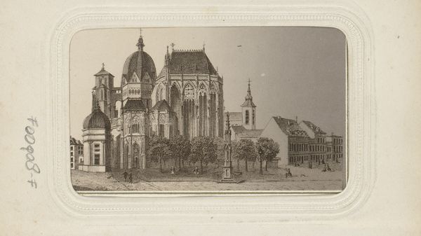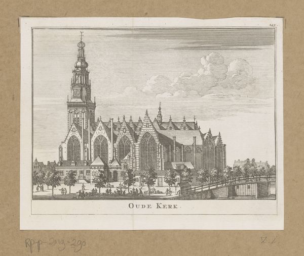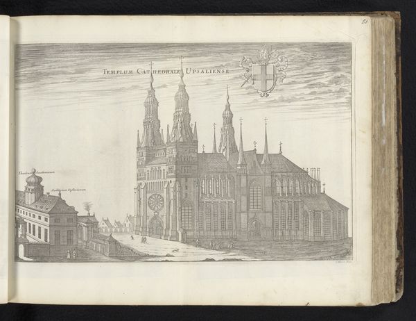 Editor: Here we have "Gezicht op de Sint-Servaas te Maastricht" which roughly translates to "View of the Saint Servatius in Maastricht", an engraving by Jacobus Harrewijn made sometime between 1700 and 1750. It's quite detailed, especially considering it’s a print. The cityscape is so clearly articulated, and I’m intrigued by the banner floating above the church. What captures your attention most about this piece? Curator: Well, as a historian, I immediately consider the public role of this image. Who was its intended audience? Engravings like these were often reproduced for a wider public than, say, a unique oil painting. This cityscape served not only as an architectural record but also as a symbol of civic pride, showcasing the importance of the church to Maastricht's identity. The baroque style reinforces the glorification of religious institutions. Does that strike you as a deliberate message? Editor: Absolutely! I see the baroque elements in the ornamentation and almost theatrical presentation. So, it’s serving a purpose beyond just documentation? Curator: Precisely. The "politics of imagery" are very much at play here. Think about what the choice to depict *this* specific building, in *this* particular style, communicates. What kind of power dynamic is visualized in presenting this majestic religious building to the wider population through a disseminated print form? Is this form of presentation reinforcing or contesting social hierarchies? Editor: It's fascinating to consider how the act of printing and distributing an image changes its meaning and impacts its influence on a population. Almost as if, creating collective buy-in on architectural achievements! Curator: Exactly! By understanding the social and institutional forces at play, we gain a richer appreciation of its place in history. This is an era where architecture was propaganda in its most elaborate form. Editor: Thank you for expanding my perspective! I went in with a purely aesthetic interest, and I hadn’t even considered it that way.