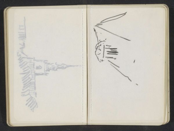 Curator: This piece is titled "Rij huizen bij een molen," or "Row of houses near a mill." It’s an ink and pencil drawing on paper by Alexander Shilling, likely from around 1909. Editor: My first impression? Haunting, like a memory fading. I see the skeletal shapes of buildings huddled together beneath the looming shadow of… is that a windmill? There’s such raw energy here, yet so much is left unsaid. Curator: That incompleteness, the fleeting nature, is quite key to understanding Shilling's practice. He created this within his personal sketchbook, part of a series of what appear to be spontaneous impressions. What sociopolitical forces might have prompted this quick rendition of rural life? Was this a reflection on urbanization, the changing landscape? Editor: Perhaps! Or, maybe he just felt inspired. Look at the frenetic energy in those lines—they practically vibrate off the page. The mill becomes this watchful presence, presiding over a village holding its breath. You know, as an artist myself, I can just picture him scribbling this down, trying to capture that very specific mood… Curator: It's also important to remember who could access such forms of artistic expression. Were there marginalized communities present, how might have economic disparities and class struggles shaped such interpretations? Editor: All that aside, can we just acknowledge how beautifully unsettling it is? Like peering into someone else’s dream, or maybe a half-remembered nightmare? Curator: Absolutely. Shilling's piece makes a space for such reflections on artmaking and accessibility, offering questions and provocations. Editor: Yeah. Looking at this sketch, you just know that, despite the simple tools, he just had something that burned so strong inside him. It reminds me why I even bothered lugging all these canvases around for all those years. So, there you have it folks! Keep sketching! Curator: A worthy note for our visitors! This brief glimpse into Shilling’s sketchbook presents an exciting lens through which to consider those issues.