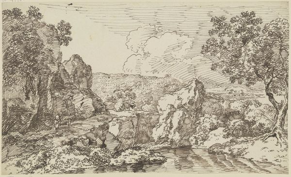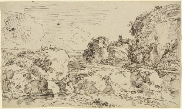 Francois van Knibbergen made this drawing, "Rocks Overgrown with Bushes," sometime in the 17th century with graphite on paper. What I find most striking here is the use of graphite, a material so common we often overlook it. It’s essentially mineral carbon, mined from the earth, then processed into a form we can hold and use to create images like this one. Notice how Knibbergen coaxes depth and texture from this humble material. The soft, almost smudged quality of the graphite gives the rocks a sense of volume and the bushes a delicate, airy feel. The drawing captures the essence of the natural world through the directness of mark-making. In its time, this work would have been considered a study, or preliminary sketch, rather than a finished artwork, a demonstration of skill but also an intimate engagement with the landscape. It reminds us that the value we place on a work of art isn't just about the final product, but also about the labor, the materials, and the artist's vision.