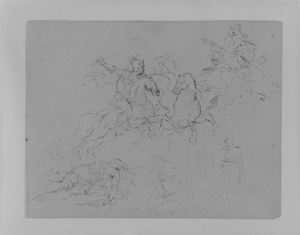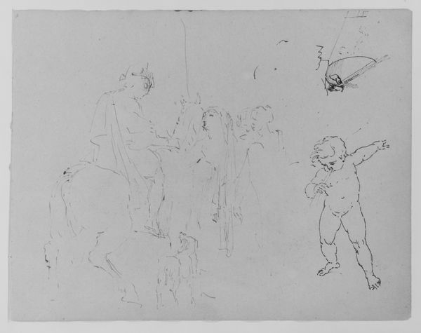Curator: Thomas Sully’s ink drawing from around 1810 to 1820, titled “Two Sketches of Females Looking out of a Window; Seated Female; Mother Playing with Child; Seated Male and Female Looking at a Book (from Sketchbook)”, captures intimate domestic scenes with swift, confident strokes. Editor: What strikes me most is the incompleteness, like fragments of memory clinging to paper. It’s airy and delicate but still…somehow heavy. There’s a mood of contemplation here, wouldn't you say? Curator: Indeed. I see echoes of Romanticism's focus on emotion and the everyday lives of women, especially in representations of motherhood. We have to recognize, however, that access to leisure and the opportunity for introspection depicted in these sketches were highly circumscribed along lines of gender, race, and class at the time. Sully himself profited handsomely from painting wealthy white families. Editor: Absolutely, context is everything. But even knowing that, I still find myself drawn to the fleeting expressions captured, especially that mother with her child. It feels universally relatable. Is that naive of me? Curator: Not at all! That emotional connection is precisely what gives this piece its power. And the sketchbook format allows for multiple narratives to intertwine, inviting layered interpretations around themes of domesticity. I also can’t help but think that the lack of finishing allows viewers to collaborate, to some extent, with the artist. Editor: You’re so right, unfinished it creates room, right? For dreaming, remembering, reimagining, even protesting if the scene doesn’t resonate for every person. It is unfinished, after all! Curator: Precisely. Considering Sully’s career and context gives these sketches added dimension, prompting us to consider the conditions that shaped both the artist's perspective and the lives of his subjects. Editor: Looking closer now, at the end of our chat, it makes me wonder whose stories remain untold within these lines and what power lies in recognizing both what’s depicted and what’s conspicuously absent.