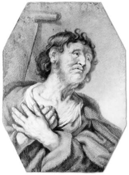 Editor: This is Karel van Mander III's drawing, "Apostelen Judas Thadæus," created sometime between 1609 and 1670, rendered in charcoal. It’s currently held at the SMK in Copenhagen. The upward gaze of the subject and the light source create a dramatic, devotional mood. What strikes you most about the composition? Curator: What captures my immediate attention is the manipulation of light and shadow which animates the figure. Note the stark contrast, especially across his face and hands. These elements create depth and accentuate the texture of his skin and the folds of his garment. Also observe the almost geometric framework provided by the composition itself, held within a clear linear structure that emphasizes form. Editor: So, you're focusing more on the relationship between light, form, and line rather than the figure or historical context? Curator: Precisely. While representation certainly exists here, our attention is best directed towards analyzing how the formal components evoke the narrative. How does the contrast of light function, beyond simple depiction, in structuring our experience of this image? Where does your eye tend to rest within the drawing's plane? Editor: My eye definitely goes to his face first, especially given how it is angled upwards towards that strong light source, which pulls my gaze to the upper-left hand corner. Curator: Yes, and consider how that light serves to not only illuminate but also to elevate the figure. It invites us to contemplate the symbolic resonance of light itself, not just in religious art but within the broader vocabulary of visual representation. What conclusions might you then draw about its use? Editor: I see. It’s a dynamic composition because the contrasting textures of shadow and line, plus the strategic placement of the light source, generate depth, thereby drawing us into an act of reverence along with the figure. Curator: Precisely. An understanding of how artistic elements function—form, line, texture—reveals a potent visual strategy.