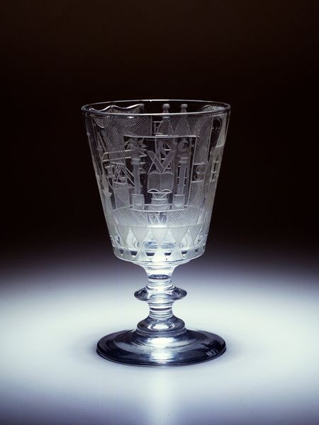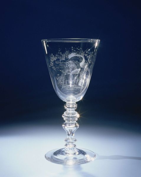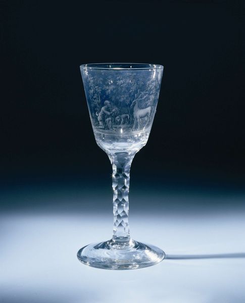 Editor: Here we have an engraved glass, specifically a "Kelkglas met het wapen van Willem V," which translates to "Goblet with the coat of arms of William V," dating from before 1798. Its transparency gives it such a delicate, ethereal quality. How do you interpret this work in its historical context? Curator: Well, this glass isn't just a drinking vessel; it's a political statement rendered in crystal. The presence of William V's coat of arms places it squarely within the Dutch Republic's tumultuous late 18th century. Look closer, and consider the symbolism embedded in the imagery. Who benefits when leaders immortalize themselves in delicate art such as this? Editor: I hadn't really thought about it that way; I suppose the imagery seems quite innocent at first glance. The cherubs almost obscure the intention. So, is it like propaganda? Curator: It is a delicate form of propaganda, definitely! Think about the Neoclassical style: the clean lines, the idealized figures, the evocation of order and stability during a time of immense political upheaval as revolution sweeps across Europe. It prompts us to question whose narratives get enshrined and whose get erased? Editor: That’s fascinating. The engraving process itself must have been painstaking! Curator: Absolutely. And consider that skill and artistry. Glass was valuable, not meant for everyone. Owning something like this signifies status and political leaning. Who owned it and at whose table it would have stood all communicate very clearly who the favored were, no? Editor: I guess it suggests that even decorative art has a political voice. It is more loaded than I initially thought! Curator: Exactly! Now when you view art like this goblet, what comes to mind? What assumptions might viewers bring to their interpretation of something that once reflected power dynamics and status, viewed from our modern context? Editor: I’ll definitely view these objects through a new lens from now on.