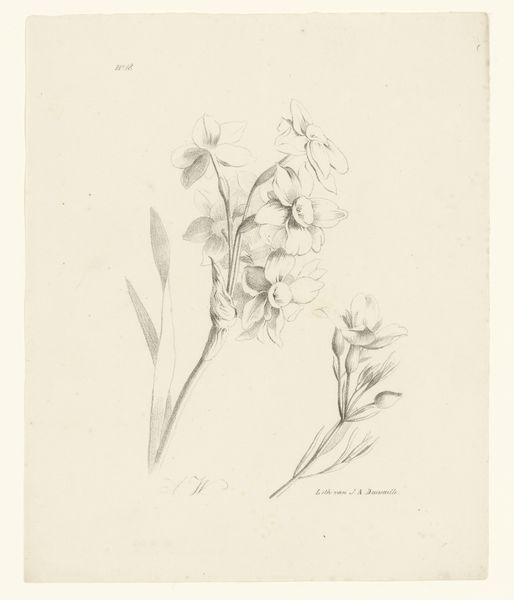 Editor: Here we have “Bloemen aan tak,” or "Flowers on a Branch," a pencil drawing on paper by Anton Weiss, from 1836. I find the delicate detail quite captivating, and almost photographic. What do you make of its quiet presence? Curator: The symbolism inherent in floral depictions throughout history is vast and ever-evolving. What at first appears to be simply a botanical study reveals layers of cultural memory. Note the precise rendering, almost scientific in its accuracy; do you think that reflects the artistic inclinations of the period? Editor: Yes, it reminds me of botanical illustrations in textbooks, a commitment to realistic depictions. Curator: Consider the blossoming branch itself: a potent symbol of spring, rebirth, and fleeting beauty. The artist has captured a moment of transient perfection. Are there any aspects of this particular branch that speak to you? Perhaps the placement of the leaves or a break in the branch? Editor: The leaves seem deliberately arranged, guiding the eye, and perhaps also demonstrating the artist's skill. The single large leaf almost anchors the entire composition. Curator: The contrast between the delicate blossoms and the strength of that leaf speaks volumes. One wonders what personal meaning Weiss invested in this simple scene. How might contemporary viewers interpret this symbolism differently than audiences in 1836? Editor: That's fascinating. Today, it feels like a quiet appreciation of nature, maybe tinged with a little melancholy given its muted tones. Thank you, I learned to observe much more than what I thought it could initially convey. Curator: Indeed, art often acts as a mirror reflecting not just the world, but also our ever-evolving selves.