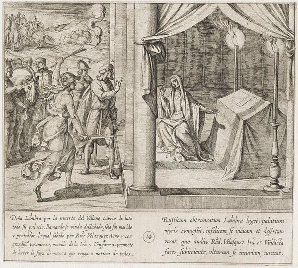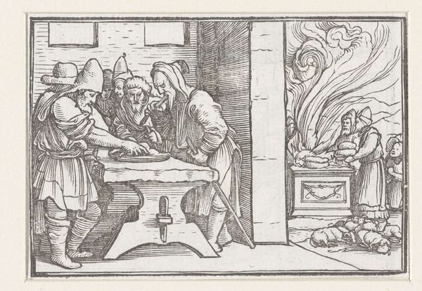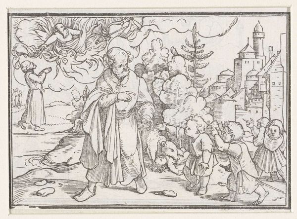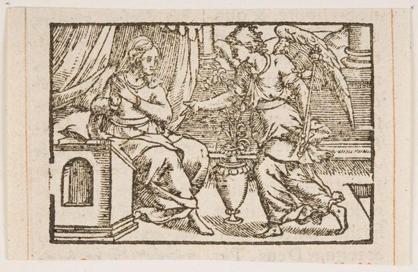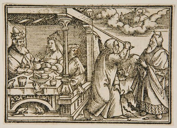 Curator: This woodcut, dating from 1538, is titled "Nathan Pointing out David's Sins." It was created by Hans Holbein the Younger and is currently held at the Rijksmuseum. Editor: The starkness of the line work really stands out; it creates a heavy, somber mood. Curator: The work employs line art as its core component to create a contrast of space and shadow throughout, as is often the case in Northern Renaissance printmaking, which allowed for distribution of imagery far more effectively than painting at the time. Notice how the architecture frames the figures. The pillars not only provide depth, but also divide the composition into distinct planes of action. Editor: That's fascinating in that it mirrors the very divided nature of power and the prophetic position of Natan. David's sins of power are really being brought to bear by a critical prophet, and Holbein shows the contrast of access, who is privileged, and the reality that ethics demand reckoning even from the powerful. Curator: We see that division exemplified visually; Natan exists inside a colonnade, while we witness a landscape beyond—what feels like an implication of the everyday consequences to come outside of the royal court. Editor: That landscape feels so alive! Especially in juxtaposition to the figures that stand more heavily ornamented by lines that denote form over freedom of movement, which underscores the degree to which the ethics of power determine larger social dynamics, as shown with Natan holding David to account. Curator: It does give one a sense of a complex system of relationships and consequence. The materiality of the print medium amplifies its ability to broadcast ethical awareness of how power implicates daily life, from kings down to the shepherds. Editor: A really sharp composition serves a complex narrative here, bringing into awareness both the structure of royal courts, as well as what's at stake when they're not oriented toward the broader good of a landscape that must be cared for ethically. Thank you for this formal framing that sheds a really stark light. Curator: You're welcome; the semiotic qualities are difficult to unsee once one really sits with it.