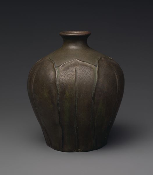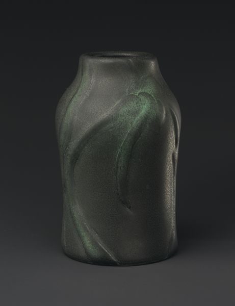 Curator: This is a striking earthenware vase, titled "Vase with Geese." It was crafted by Artus Van Briggle, dating from around 1900 to 1902. Editor: Immediately, I’m struck by the tactile quality of this piece. The earthy tones and the matte texture give it an almost primal feel. Curator: Absolutely. Van Briggle was a key figure in the American Art Nouveau movement. He aimed to create art for the people, accessible and integrated into everyday life. Think about the Arts and Crafts movement, the burgeoning middle class and how these decorative art pieces brought beauty into their homes. Editor: The geese, rendered in low relief, become almost abstract as they merge with the fluid, organic lines. The semiotics of the undulating lines suggests water and also the flight of the birds. The monochromatic scheme further unifies form and image. Curator: The geese are not merely decorative, they're symbolic. In some cultural interpretations, they represent fidelity, communication, and even the journey of the soul. The flowing lines of the piece echo the natural world, a common theme in art of this period as a rejection of industrialization. This can be tied into growing awareness and romanticisation of the landscape during that era. Editor: Indeed. The careful application of the glaze creates a subtle variation of light and shadow, further enhancing the texture. Its surface, not polished to a high sheen, presents an almost geological aspect. Curator: And it's important to note the inherent contradictions here: this artwork exists within the context of American progress but references more ancient or primal connections, gesturing at deeper philosophical links that cross cultural barriers. Editor: For me, that earthiness anchors its artistic expression, keeping it from being purely aesthetic or cerebral. Curator: It serves as a physical reminder of our inherent connection to the earth. Editor: Looking closely reminds us to examine surface and content. Curator: Yes, consider these subtle ways the external world influences our interpretation of its deeper narratives.