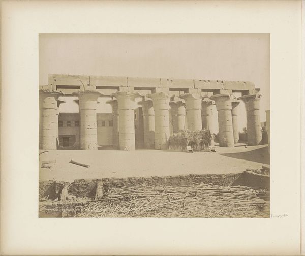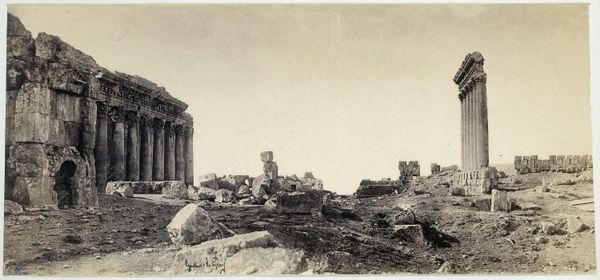Editor: This is Francis Frith's photograph of The Erechtheum in Athens. The sepia tones give the ruins a very solemn, almost ghostly feel. What do you see in this piece, from a formalist point of view? Curator: The photograph offers a striking study in contrasts. Observe the sharp detail in the foreground ruins against the softer focus of the distant landscape. Frith masterfully uses light and shadow to accentuate the architectural forms. Editor: The way the light plays on the Caryatids is incredible! Curator: Indeed. And how the linear precision of the remaining structure contrasts with the organic textures of the surrounding decay. These visual elements contribute to the photograph's inherent tension. Editor: It's fascinating how Frith used composition to highlight both the grandeur and the ruin. Thanks for pointing out those details! Curator: My pleasure. It is through such careful attention to form that we may appreciate the artist's vision.