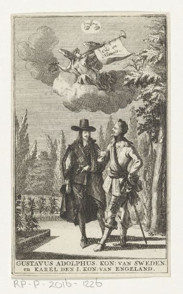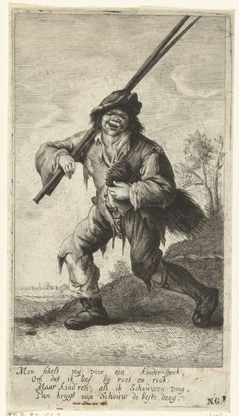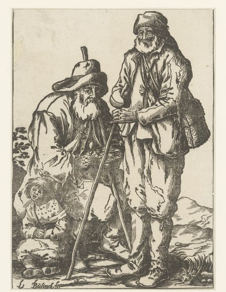 Petrus Johannes van Reysschoot created this print, "Jager", without a specified date, using engraving techniques. The image depicts a young sportsman, a hunter, accompanied by an older man, likely his mentor, and several dogs, displaying the spoils of their hunt: a dead hare. Such imagery speaks to the social structures of the 18th century in the Netherlands, where hunting was both a recreational activity and a means of sustenance. The work is reflective of the economic structures of the time, where land ownership and the right to hunt were often associated with social class. By examining the artist's other works, or by consulting records of hunting practices in the 18th century Netherlands, we can deepen our understanding of the social conditions that shaped the image and its original audience. The meaning of art is contingent on its social and institutional context, and the role of the historian is to unpack these layers of meaning through careful research and analysis.