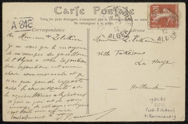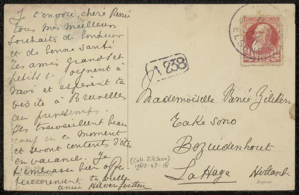 This postcard was sent by Emile Bernard to Andries Bonger and Anne Marie Louise van der Linden in 1912. Its material simplicity is deceptive. What starts as a mass-produced card, printed with a generic format in anticipation of widespread use, is transformed by the artist's hand into a unique artifact. The ink, applied with deliberate strokes to convey a personal message, takes on a far greater significance than its base components might suggest. It bridges the gap between sender and recipient, carrying not just information, but also emotion and intent. The postal stamp and markings are also significant; each one involved the labor of countless workers, connecting individuals across geographical distances. By engaging with this everyday medium, Bernard elevates it to a form of intimate expression. This challenges traditional notions of what constitutes ‘art,’ reminding us of the profound impact even the simplest materials can have.