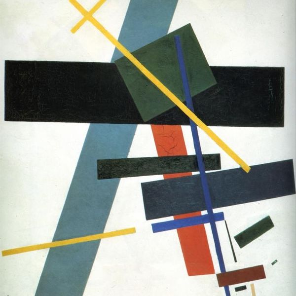 Curator: This is László Moholy-Nagy’s “E-Bild,” painted in 1921. It is a compelling example of geometric abstraction within the Bauhaus movement. Editor: Stark and primary! The sharp lines against that muted beige background create a very modern feel, even a century later. It looks like it’s still in progress…almost like an unfinished tech schematic. Curator: The Bauhaus was all about uniting art, craft, and technology. The clean lines and geometric shapes speak directly to that industrial aesthetic. Notice how Moholy-Nagy reduces forms to their bare essentials. Editor: Yes! Look how the simple use of line and block defines not just shapes, but also implied spatial relationships. The “E,” the verticals…it all builds this shallow but definite plane. Are those subtle pencil markings in the lower corner too? Curator: Interesting observation! It also highlights Moholy-Nagy’s commitment to experimentation and his vision of art integrated with modern life. He moved away from traditional artistic notions, inviting new perspectives to embrace social change. Editor: Absolutely, I get that. He seemed to want to dismantle any sentimentality, even within abstract form itself. It’s cerebral rather than expressive; each line and shape perform a structural function within a calculated whole. Curator: Exactly! Consider how this piece challenged conventional artistic boundaries in Weimar Germany, a period rife with political and social turmoil. His functional design aesthetic was incredibly forward-thinking for the time. Editor: Knowing its history provides a new depth to it. But ultimately, it's that formal interplay of shape and color that really gets me. It manages to feel both rigid and somehow dynamic, despite the simplicity of means. Curator: Seeing the work in this historical context makes its impact clear: “E-Bild” wasn't just a painting; it was a manifesto for a new way of thinking about art and its role in society. Editor: I appreciate how the form is inseparable from its revolutionary intent. Analyzing both the art and social environment enhances its significance so powerfully.