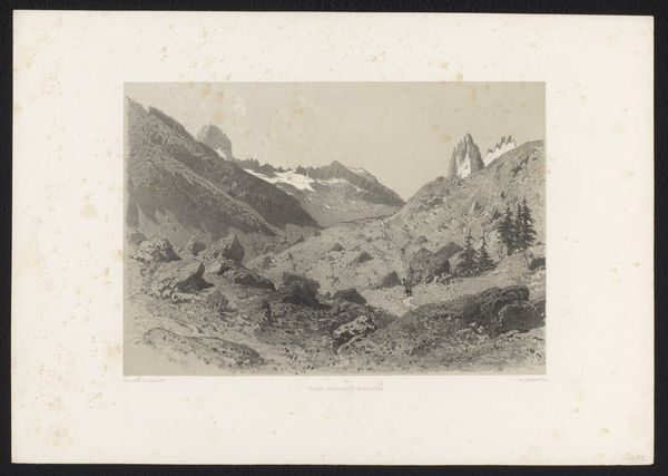 Curator: This is Hans Thoma's "Berglandschap," created in 1917. It's a pencil and ink print on paper. What strikes you first about it? Editor: There's a kind of quiet intensity in the lines. It feels delicate, almost hesitant, but the composition pulls you into this valley quite powerfully. Curator: The landscape evokes a longing for an idealized German past, one deeply intertwined with the political upheavals and national identity anxieties of the early 20th century. Thoma positions the rural landscape as a refuge, opposing the march of modernity and the disruptions of industrialization. The question remains if this representation authentically mirrors rural experiences. Editor: From a formal point of view, it's fascinating how the artist has used such simple means—lines, shading—to create a sense of depth and scale. The mountains in the background, especially, feel immense, while the cottage in the foreground seems to anchor the whole composition. Semiotically, we see clear juxtapositions, the crude roof versus the soft sky. Curator: Precisely! Considering the German Expressionist movement, it also reflects a collective grappling with trauma, exploring themes of alienation, disillusionment, and a yearning for authenticity. Thoma seems to tap into these sentiments, representing landscape as both a physical space and a psychological terrain marked by collective trauma and individual struggles. Editor: Looking at how light and shadow interact, it reminds me of certain photographic processes of the time. Perhaps the artist wanted to invoke this particular moment using contemporary reproduction processes that themselves echoed the industrialisation they eschewed? Curator: And perhaps comment on the rapidly evolving representation of place during that pivotal period. Editor: Indeed. Curator: Reflecting on our conversation, what stands out most is the tension between the artist's subjective experience and the socio-political landscape he inhabited. Editor: Agreed. It shows just how potent an impact minimalist compositions can evoke.