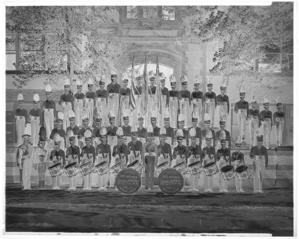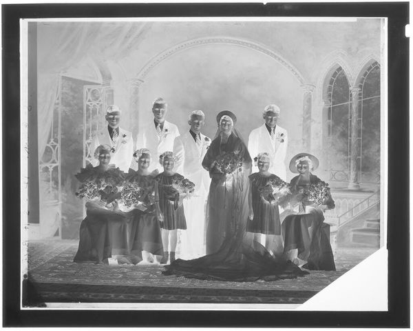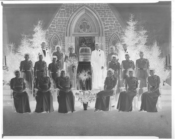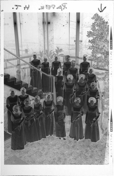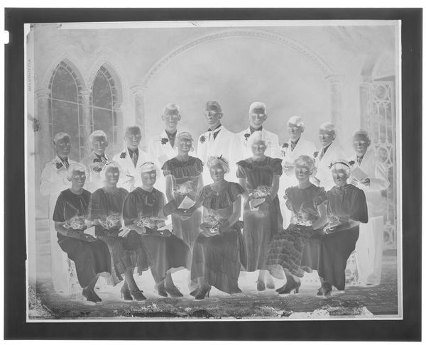 Curator: This small photographic negative at the Harvard Art Museums, attributed to John Deusing, is titled "Untitled (nine men and nine women in formal wear)." Editor: It’s striking how the negative image makes the figures appear almost spectral, like ghosts emerging from a bright, otherworldly space. Curator: The composition, with the nine women seated and the nine men standing behind them, suggests a formal occasion, perhaps a graduation or a wedding party. Note the architectural background with arched windows. Editor: The formal wear certainly indicates a specific social ritual. I'm curious about the power dynamics at play here, the very deliberate arrangement perhaps reflecting societal expectations of gender roles at the time. Curator: Indeed, the visual weight of the men positioned behind the women subtly reinforces traditional hierarchies. The bouquets held by the women, conversely, could symbolize fertility or new beginnings, laden with their own symbolism. Editor: That inversion of light and dark really does prompt reflection on how we interpret images and the social structures that they both reflect and reinforce. Curator: Absolutely, it's a reminder of the complexities embedded even within seemingly simple photographic portraits.