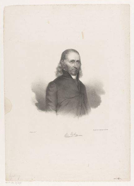 Curator: Let's turn our attention to this intriguing piece titled “Portret van een onbekende man, mogelijk F.L. Urban,” or "Portrait of an unknown man, possibly F.L. Urban." Created sometime between 1875 and 1905, it appears to be a lithograph and engraving over graphite. Editor: It strikes me as quite somber, actually. The muted tones and the sitter’s intense gaze create an immediate impression of gravitas. I'm particularly drawn to the rendering of the coat. Curator: Observe how the artist uses light and shadow. The modeling of the face, in particular, relies heavily on contrast to define form. It presents a calculated use of chiaroscuro, almost theatrical. How do you interpret this stylistic choice in the context of 19th-century portraiture? Editor: That drama is classic Romanticism. Think about the socio-political tensions of the time—growing nationalism, industrialization, and revolution. A portrait wasn’t just a likeness; it was a statement, often about status or political leanings. The sitter's long beard and slightly disheveled appearance present an interesting challenge to the social portrait, though the expensive-looking coat seems to subvert such challenge to middle class tastes. Curator: Indeed. Consider how the linear precision of the engraving contrasts with the softer, more fluid graphite work. These opposing textures create visual tension, pulling the eye across the surface and activating the space. There's a controlled energy within this framework, enhanced by the subject's contemplative aspect and his pose that invites us to engage more closely. Editor: Precisely! The ambiguity of the subject—an unknown man possibly identified as F.L. Urban—further reinforces the broader issue of representation. He seems conscious of being observed and attempts to present himself, his political persona, in what appears to be a precise alignment to the expectations of the time. The unknown aspects leave it open to broad cultural interpretation. Curator: In terms of purely visual design, what captivates me most is how the subtle gradations of tone, particularly in the face, transform an ostensibly simple image into a deeply evocative composition. The lack of bright hues allows formal structures to step into full light. Editor: And I’m left pondering who this unknown man really was, what his stories were, and how his image resonates—or clashes—with our understanding of the era’s political climate and individual expression. The lack of definition of his public status beyond middle class is one thing that still puzzles me.