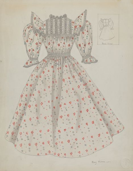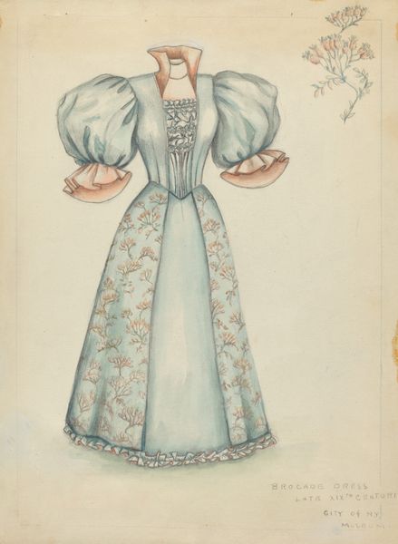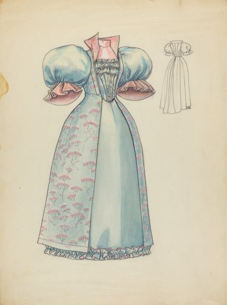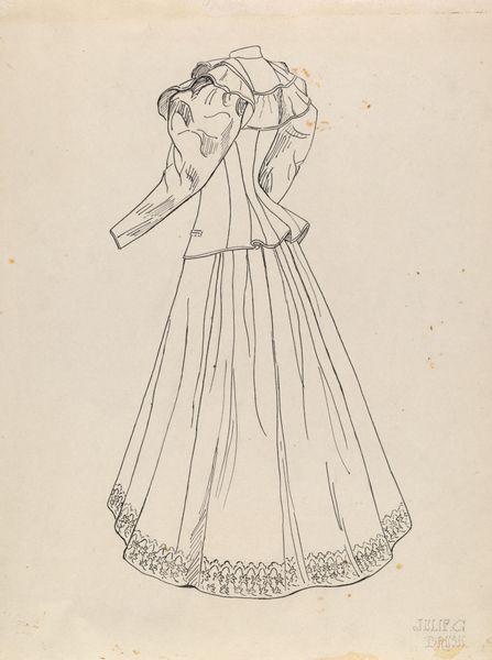 Editor: Here we have "Biedermeier Fashion," a 1908 drawing and print currently housed at the Met. The dress is lovely, it seems like it might be hand-made, very ornate. I’m curious about its purpose. What do you see in this piece, considering its time and materials? Curator: What I see here is an advertisement - the “means of production” involved. It isn’t just about depicting clothing; it’s about fueling consumer desire. The printmaking process itself – likely mass-produced lithography or something similar - puts fashion within reach of a wider audience. Editor: So you're saying that the image, as a mass-produced print, democratized access to fashion? That’s interesting, I never thought of it that way! Curator: Exactly! And notice the Biedermeier reference, a style from almost a century earlier known for its emphasis on middle-class values. Janke appropriates the historic, connects the aesthetics of the past to this early twentieth century consumer present. Editor: Right. By referencing that older style, the image positions this new garment in continuity with traditional craftsmanship. But is that an accurate reflection of how the garment was made? Curator: That's the critical point, isn’t it? We can't know from the print alone whether that labor involved careful needlework or mechanized factory production. But it directs the viewer's focus toward the artistry rather than toward industrial manufacture. Editor: I see… The medium acts almost like a smoke screen for the methods behind the garments. What would you say is the purpose? Curator: The labor that went into the making. Who sewed it and how? Was it an original or simply reproduced? Fashion as aspiration – divorced from the reality of the labor that produces it. Editor: So, instead of just seeing a pretty dress, we're considering how it connects to production and consumption…it makes you wonder. Thank you for that eye-opening insight.