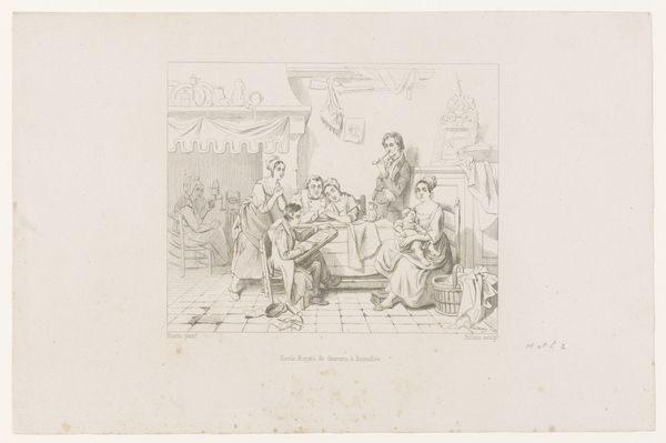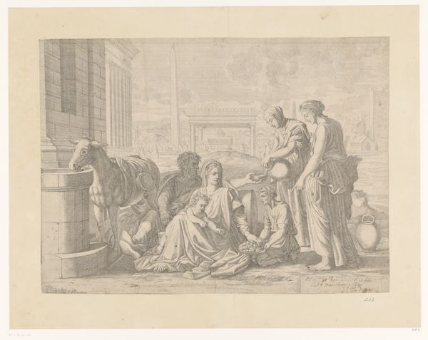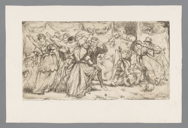 Curator: This drawing by Mari ten Kate, likely created between 1841 and 1910, is titled "Verkoop van tot slaaf gemaakte mannen, vrouwen en kinderen"—"Sale of Enslaved Men, Women, and Children." It depicts exactly what the title describes: a slave auction. Editor: It’s a stark scene. The texture is all created by line and the composition leads the eye straight to the point of transaction. Look at the sharp delineation, creating form that reinforces the inhumanity of the moment. The building behind appears decayed, but this in stark contrast to the fine clothing of those doing the buying and selling. Curator: Precisely. It lays bare the mechanics of the slave trade, focusing on the act of exchange. Ten Kate, though working later in the 19th century, seems to be grappling with the legacy of slavery and its continued impact. It is interesting to remember that the Netherlands was one of the last Western countries to outlaw slavery. He offers a perspective that prompts critical reflection on Dutch colonial history. Editor: And the means of its creation is particularly disturbing; this looks like an engraving or a print— easily reproducible, cheap to distribute. How many copies of this image were made, who was the intended audience, and to what end? Curator: Those questions become urgent, especially when thinking about the proliferation of such imagery at the time and how it was implicated in the ongoing political debates about abolition and human rights. Ten Kate situates these exchanges not just as isolated events but as part of a larger network of power and exploitation. We need to contextualize it as one voice, albeit one among many in the visual representations of slavery, and also think critically about how this era constructed Black identities and subjected bodies. Editor: Absolutely. And you're right, the very material of the artwork is the medium of a very disturbing message. The labor behind reproducing this would itself implicate another form of "production," which reinforces its message. This image does not appear on its own, and in viewing it we also ask: what labor went into its means, its construction, its ultimate "marketability," as it were? Curator: Yes. Looking at art requires this kind of deconstruction to fully appreciate the weight and consequence, not only in historical context, but also in the long-term ramifications still present today. Editor: Indeed. Examining this work through a materialist lens illuminates how deeply enmeshed art can be in social and political practices.