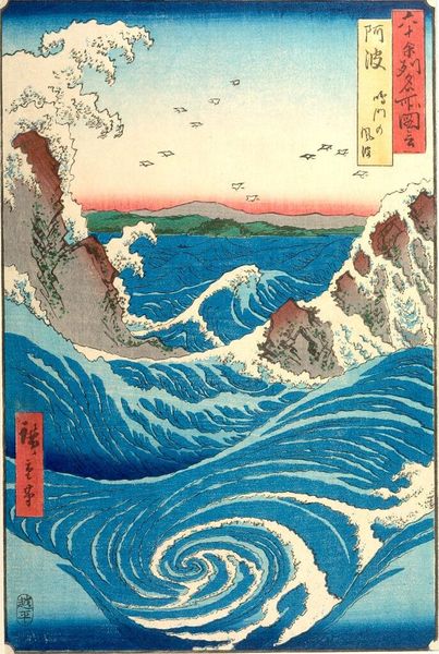 Curator: Kuniyoshi's "Enoshima in Sagami Province" presents a dynamic perspective. It’s difficult to date precisely, but he lived from 1797 to 1861. Editor: It's a visceral image. The sheer mass of that rock formation, those lines pulling the eye downward, it evokes a sense of elemental power. Curator: The cliff, rising dramatically from the sea, speaks to the enduring power of nature, especially relevant in a society shaped by environmental forces and social hierarchies. It can be read as a commentary on enduring strength. Editor: I see it too in the context of Shinto beliefs, islands are sacred, thresholds between worlds. Enoshima itself is dedicated to Benzaiten, a powerful goddess. The landscape feels charged with her presence. Curator: Acknowledging that indigenous traditions persist and are often co-opted by dominant cultural narratives is crucial to a better understanding of this artwork. Editor: Precisely. It's a reminder that even landscapes are imbued with layered meanings, shaped by cultural memory. Curator: Understanding these multiple layers is key. Editor: Absolutely.