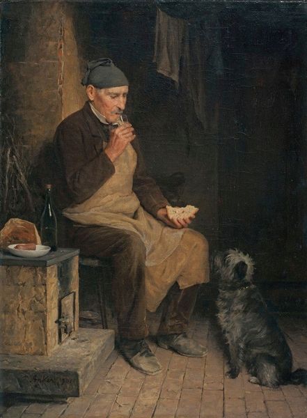 Curator: Gustav Vermehren's painting, "En kræsen rad," which translates to "A Fastidious Chap" from 1893, depicts an intimate scene of an elderly man and his pug. It’s rendered in oil on canvas and is a beautiful example of genre painting and realism. Editor: It feels quite melancholic. The subdued palette, the solitary figure – it’s very intimate, but almost too heavy, isn’t it? Curator: Perhaps, but I think the beauty lies in Vermehren’s keen eye for the material conditions. Notice the detail in the textures: the rough-hewn wood of the floorboards, the soft fur of the pug, the worn fabric of the man's clothing. It’s not just about sentiment; it's about the everyday life rendered in paint. How do the artist's means, for instance the oil painting tradition, reflect contemporary views on domesticity and companionship? Editor: Good point. And the composition really directs your eye. That strong diagonal created by the floorboards and then, how that's mirrored in the position of the old man seated on the side. It really places the man as part of the larger domestic world. It suggests a kind of harmony between them – not that the institution, if you can call his domestic sphere that, cares very much. He has his companion though. Curator: And how might Vermehren have experienced such companionship, given that artistic circles in the period encouraged more independent production and creation? What social context shaped the accessibility of such images and allowed the widespread use and reception of those kinds of oil paint renderings? It would be fascinating to know the exact chemical compounds present here. Editor: I see it as a reflection on aging, the changing social landscape and our perceptions on value – both material and emotional. But I get what you mean; he shows incredible facility for the materials here. It's more complex than pure sentimentality. And clearly there was a demand among audiences. Curator: Indeed. It offers an interesting insight into the intersection of artistic practice, consumer culture, and the ways in which domesticity and personal narrative are communicated through visual mediums. Editor: Well, for me it underlines how we tell stories through art, stories that might otherwise be silenced by societal structures, reminding us that art acts a cultural mirror to personal experience.
