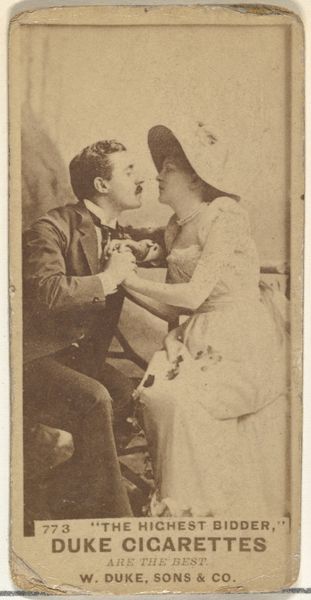 This card was created around 1890 by W. Duke, Sons & Co. as a promotional item for Duke Cigarettes. At first glance, the sepia tones and composition suggest a staged moment of courtship. The man, kneeling, offers a gift to the seated woman, creating a visual hierarchy emphasizing her power. Analyzing the composition further, the dark background throws the figures into sharp relief. The contrast between the textures of their clothing—the man's tailored suit against the woman's flowing dress—implies a social dynamic defined by ambition and presentation. Given the commercial nature of the card, these carefully constructed details become signs within a larger cultural narrative. The gesture of offering, combined with the text “The Highest Bidder," can be interpreted through a semiotic lens. Ultimately, this card uses a romantic tableau to subtly communicate the value of the Duke Cigarettes. It suggests a world where quality and aspiration are always in play, just like the art of seduction. The visual and textual elements work together, creating a layered message that speaks to both personal desires and the allure of consumption.