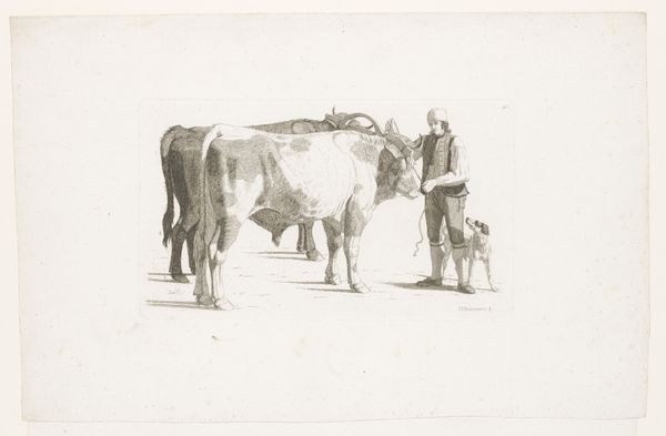 Curator: Here we have "Weiland met koeien bij een trog," or "Pasture with Cows at a Trough," a mixed-media drawing crafted by Johannes Tavenraat somewhere between 1864 and 1868. It’s currently held at the Rijksmuseum. Editor: My initial impression is of quietude. The muted tones and blurred lines give it a dreamlike, almost melancholic feeling. There's a strange stillness. Curator: Absolutely. The placement of this drawing within Tavenraat’s oeuvre reveals his dedication to depicting the Dutch countryside in an honest and unromantic light, contrasting the more idealized visions of his contemporaries. His focus on the everyday labor and environment is clear. Editor: Cows around a water trough evoke a timeless pastoral image. Notice how the trough itself is rendered with a kind of sturdy, pragmatic design, its symbolism rooted in sustenance and community, recalling agricultural rituals across centuries. The muted palette evokes a nostalgia for rural simplicity. Curator: Interesting point about rituals! It’s important to consider how these seemingly simple images reflect larger cultural shifts. The rise of industrialization in the late 19th century made rural scenes a powerful symbol of Dutch identity. It's this pastoral scene that many wished to hold onto, amidst a rapidly changing society. Editor: That resonates with me. These cows become symbolic then. Their quiet existence against the horizon speaks of an innate, timeless connection to the land, even as that land becomes threatened by something looming in the background of those little houses. Curator: Indeed, the seemingly quaint image is heavy with complex societal undertones of the era, acting as a potent reminder of a disappearing way of life that needed preservation within the collective memory. Editor: Looking closer, the economy of line is fascinating—almost like a sketch quickly capturing a fleeting scene. Tavenraat is masterfully presenting not just cows at water, but an emotional landscape of the shifting Dutch world. I admire this encapsulation. Curator: This piece, as a historical document, prompts us to reflect on how we, as a society, view progress and preservation and what aspects of our cultural heritage we choose to enshrine and safeguard in the face of constant change. Editor: Yes, it speaks to a deeper human need to remember the past and, maybe, find solace in those enduring images. Food, water, the land. Maybe there's hope, a sense of grounded continuity there.