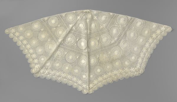 Editor: So, this delicate piece is a parasol cover from somewhere between 1875 and 1900. It's crafted from machine-made white cotton lace. There's something so fragile and precious about it. The repeating geranium pattern feels both ordered and wild somehow. What draws your eye? Curator: Oh, the ghosts it holds, darling! Imagine strolling beneath it, shielded from the sun, perhaps whispering secrets. It’s a dance between industrial precision – that machine-made lace – and a longing for the natural, the floral motif suggesting a secret garden. Doesn't it whisper of Romantic ideals clashing with the dawn of mass production? I wonder, was this a status symbol, a pretty adornment, or perhaps even a tiny act of rebellion against the rigid norms of the time, carried in the hands of a free-thinking woman? Editor: Rebellion? I hadn't thought of it that way. More of an escape, maybe? Or just a pretty object. Curator: Perhaps both, interwoven! Like the threads of the lace itself. It makes you ponder, doesn't it? How everyday objects can be imbued with such depth, such silent narratives. Editor: Definitely! I am really seeing it with a fresh perspective now.
