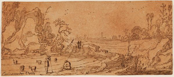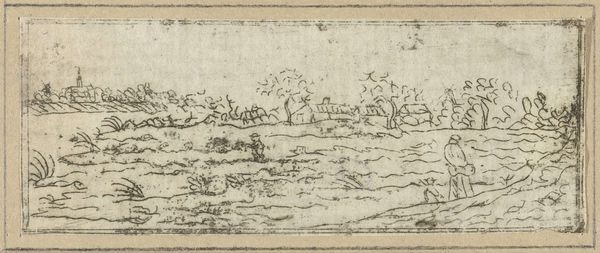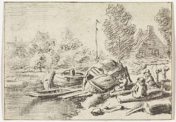 Curator: Today, we’re looking at François Joseph Pfeiffer’s pen and ink drawing on paper, titled "Winterlandschap met boerderijen," created sometime between 1793 and 1835. Editor: Brrr, I feel cold just looking at it! It’s that bleak, northern European kind of winter. Sparse, the lines all scratchy... you can almost hear the wind whistling through the bare trees. Curator: Precisely. Pfeiffer masterfully employs line variation and tonal contrast to evoke the harshness of winter. Note how the stark, almost skeletal branches create a network of lines against the pale sky, contributing to the overall sense of desolation. Editor: But there's a kind of quiet beauty there, too, wouldn't you say? That little cluster of figures near the right – a parent pulling a child on a sled, perhaps? It injects a bit of human warmth, a narrative. A suggestion of resilience in the face of a tough season. Curator: An astute observation. Pfeiffer deliberately places these figures within the vast landscape, highlighting the relationship between humanity and nature. Their presence provides scale and emphasizes the environmental challenges. From a structuralist viewpoint, it demonstrates the semiotic function of visual elements within a Romantic schema. Editor: Romantic, yes, definitely. There’s this raw, untamed quality that sings of the power of nature, the tiny humans grappling with the immensity of it all... It feels almost like a visual poem. I imagine the artist bundled up against the cold, frantically trying to capture that feeling before his fingers froze stiff. Curator: Furthermore, consider Pfeiffer's deliberate avoidance of detail. The broad, undefined strokes create a sense of atmosphere, focusing instead on the essence of the scene: the biting cold and the resilience of those who endure it. The drawing's composition, analyzed structurally, provides a pathway into deciphering its deeper thematic resonance. Editor: Thinking about it, it also hits that sweet spot of "genre painting," right? Everyday life stuff. The thing I love about that is its potential to be endlessly relatable – like, "hey, that's kinda like me, just a couple of hundred years ago". Curator: Indeed. Pfeiffer distills the everyday into its essential visual components. Thank you for those insightful remarks. Editor: Thanks to you! This just gave me a new appreciation for a scene I otherwise might have dismissed as gloomy. Now, I see poetry.