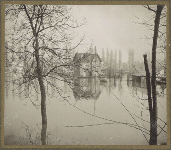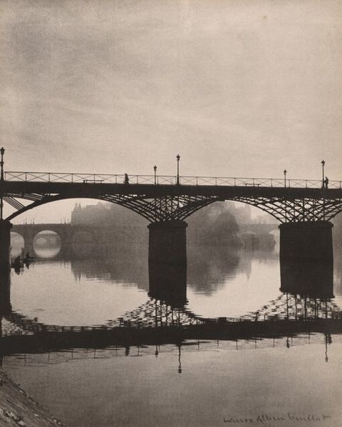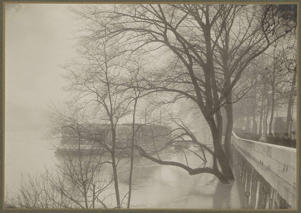 J.H. Field made this photograph, "Spoor's Bridge," using gelatin silver print. The bridge is shrouded in fog, its steel structure looming over the water, next to a small boat. Made in the early 20th century, this image reflects a period of rapid industrial expansion in the United States. Bridges like this one facilitated commerce and connected communities. The steely gray tones and the industrial architecture suggest a changing social landscape where nature and industry coexist, yet the fog obscures any clear view of progress. Photographs like this were used as evidence to promote the idea of the USA as a modern nation. But the choice of subject – a misty scene with a rustic boat – also evokes a sense of nostalgia for a pre-industrial past. Historians can use census records, city planning documents, and local archives to uncover the economic and social context surrounding this bridge, enriching our understanding of the values and anxieties of the time.