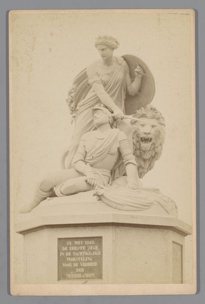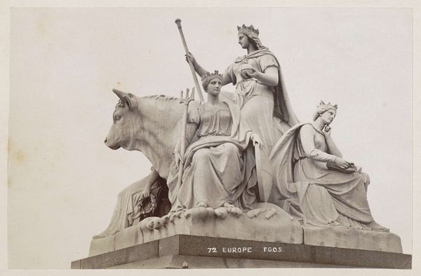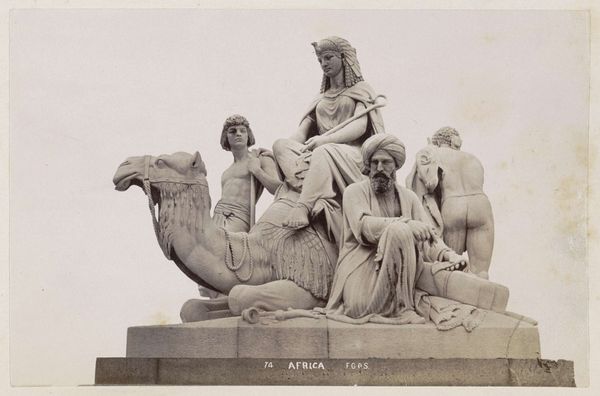 Editor: This is "Beeldengroep aan de voet van het Albert Memorial in Londen: Amerika", a marble sculpture group created by Francis Godolphin Osbourne Stuart between 1878 and 1890. I’m struck by how idealized these figures are; there’s a distinct visual language being employed. How do you interpret this work, especially within its historical context? Curator: The allegory of "America" in this sculpture reveals a great deal about Victorian attitudes towards colonialism and race. Notice how the figures are arranged, particularly the positioning of the indigenous figures in relation to the classically inspired figures, and even the buffalo. Who seems to be in control? Editor: The classically dressed figure certainly appears dominant. It seems to suggest a hierarchy with "civilized" Europe guiding "untamed" America. Curator: Exactly. Consider also the inclusion of the buffalo, representing the American wilderness. What statement does it make by placing it at the feet of the other figures? The sculpture presents a very specific, constructed narrative. Can we accept that today? Editor: I suppose it suggests the subjugation of both nature and indigenous populations in the name of progress and expansion, it doesn't sit well. Curator: And whose progress? Who is benefitting, and at whose expense? These are vital questions to consider when engaging with works like this. It’s a monument, yes, but it’s also a deeply political statement reflecting the values and biases of its time. What would you want viewers to consider? Editor: I think I would want them to understand the historical context and question the narratives that are being presented. Art isn’t neutral. Curator: Precisely. By examining these historical pieces critically, we can better understand how these biases continue to shape our present.