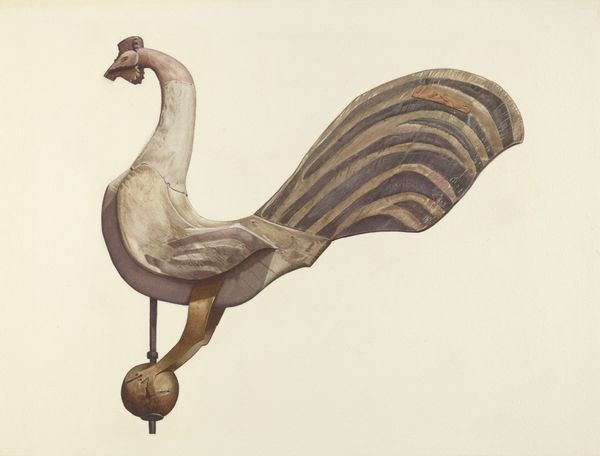 Editor: So, here we have Amos Brinton's "Owl Pitcher," dating back to around 1938. It looks like a drawing, maybe watercolor and colored pencil, on toned paper. It's so curious - it’s a drawing *of* an object, rather than being an object *itself*. What strikes you when you look at this? Curator: It's interesting to see Brinton, presumed to be primarily a painter, create what is essentially a record. Consider the socio-economic context. Was this created for documentation? Is this maybe preparatory design work for ceramic production? The choice of media further complicates things. Watercolors suggest a concern with the visual effect, rather than technical accuracy. Editor: So you think that the goal here isn’t necessarily just to capture what the pitcher looks like? Curator: Precisely! Think about the power dynamics inherent in how museums collect and categorize objects. Why preserve *this*? How does this fit with Brinton’s other work? The artist is choosing to depict a functional item as a standalone work, thereby conferring some kind of cultural worth upon an everyday object. Editor: The political context gives the image so much more depth, I hadn't considered the implications behind the choice of medium or subject. It is interesting to me now how the animal connects to social status of the owner of the jug. How is this image used as advertisement and branding of wealth? It makes me appreciate art history more! Curator: Exactly! Consider how these visual languages are created and perpetuated over time and who benefits. It all encourages me to think more about what art, and our perception of it, says about our society. Editor: It is a completely fascinating. Thanks for highlighting that!