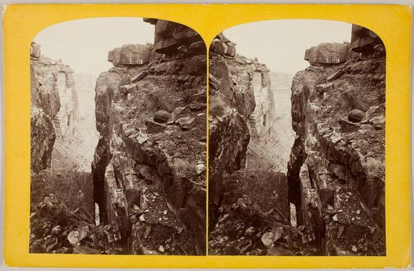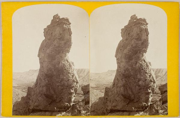 Curator: Charles Gaudin took this stereo photograph in 1868, showing Zandsteenrots Malý Pravčický Kužel in Bohemian Switzerland. Editor: There’s a stark beauty to this, almost severe. The sandstone formation, this obelisk really, has this uncanny presence, like some ancient monument guarding the land. It makes me think about geological timescales…it kind of blows my mind, honestly. Curator: Gaudin’s framing enhances the feeling. Look how he positions the rock pillar against the backdrop of the expansive forest, the layers of receding hills. Editor: Yes, and that choice is also implicated within early tourism practices in this region! The German name 'Bohemian Switzerland' speaks to the power of imposing Romantic ideologies upon landscape for a public increasingly encouraged to encounter "nature". This is further influenced, if you ask me, by histories of extraction in the region as sandstone quarries became very prominent during Gaudin's life. What we are seeing here, I think, is actually an encounter shaped by violent imperial gestures. Curator: Well, even with the industry around it, this place has undeniable spirituality about it. It's hard not to see this rock face and ponder time...the very slow pace it can operate on. To imagine its long silent existence... I am overcome with an urge for silent meditation just by seeing it. Editor: It is striking, no doubt. I wonder, what does it mean to isolate the solitary pinnacle to which the viewer has no possible access? I feel dislocated by that...there's some of that in Gaudin's choices here that mirror concerns with nationhood and citizenship that dominated Bohemian political movements later into the nineteenth century. I think that isolation is at once seductive and violent. Curator: Interesting. So we can agree it sparks thoughts... whether toward the geological, or the social and political implications of the place? It certainly gets you thinking. Editor: It does indeed, especially about our entangled relationships with the places we inhabit and document.