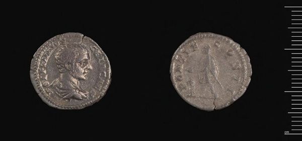Curator: This is a silver denarius struck by Juba II, King of Numidia and Mauretania. Editor: The worn texture and low relief of the coin give it a tangible quality, evoking a sense of ancient history. Curator: Indeed, these coins offer insight into Juba's efforts to Romanize his kingdom while asserting his own authority through portraiture and symbols. The Latin inscription around the ruler’s head is a deliberate association. Editor: Semiotically, the visual language is compelling—a merging of cultural identities expressed through carefully chosen imagery. Curator: Absolutely. They speak to the complexities of identity and power in a region undergoing cultural transformation. Editor: It's fascinating how such a small object can hold so much historical and artistic information.