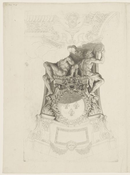 Curator: I find myself captivated by this fragment of a ceiling painting, dating from 1679 to 1728. It's attributed to Jean-Baptiste de Poilly and rendered meticulously in pencil. My first thought is "grandeur meets fragility." Editor: My initial impression is how much it feels like an act of labor, the intricacy of detail almost painful to imagine executing. There's a real physicality communicated even through the delicate lines. Curator: It's intriguing how de Poilly manages to convey Baroque dynamism with such restrained means. You have these muscular male figures—presumably allegorical—supporting the architectural framework with evident strain. It makes one wonder about the power structures it aims to portray. Editor: Exactly! The depiction of these male figures – seemingly forced into labor – immediately provokes considerations about social class and what labor practices are being monumentalized within spaces for wealthy consumers. The piece feels imbued with subtle class tension; you have wealth made possible by bodies put to work in uncomfortable ways. Curator: I agree; the inherent tension underscores the construction of power. But look closely at the heraldic symbols intertwined with laurel wreaths— these decorative motifs not only signal nobility but likely indicate a patron's identity as well. The artistic choices reflect very directly what mattered materially to those in power at the time. Editor: Yes, but what is deliberately absent? De Poilly’s focus directs our eye towards the spectacle of masculinity, while ignoring women who were, in many cases, performing other domestic kinds of labor or participating more directly within visual culture. Those omissions create a palpable imbalance we ought to address directly. Curator: A strong and valid point. I think focusing on the material reality of pencil drawing, the labor involved in production, brings nuance to readings centered on more figurative analysis. Together, it opens new perspectives. Editor: I concur; that intersection between production and ideology offers much needed insights to a new generation of scholars.