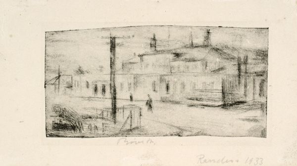 Curator: Let's discuss James McBey's 1905 etching, "Bridge near Leith." I find the tonal range quite striking for an etching, creating a rich atmospheric perspective. What's your initial impression? Editor: It feels melancholic to me, almost ghostly. The figures walking across the bridge seem like fleeting shadows against the weight of that dark structure. It evokes a sense of transience. Curator: Indeed. McBey made this early in his career, and while influenced by Whistler, it shows his own style emerging. The industrial backdrop, Leith being a port district of Edinburgh, suggests a narrative beyond a mere picturesque landscape. The city was transforming at the time. Editor: Precisely. Thinking about that context—rapid industrialization, urbanization—the stark bridge looms not just as an architectural element, but as a metaphor for connection and division. Who is benefiting from that connection, and who is marginalized? The limited visibility also seems to hint that something obscure is happening behind it, that this connection may only favor some parts of the community, perhaps an elitist one? Curator: The etching technique itself contributes to that feeling. The delicate lines capture both the solidity of the bridge and the ethereal quality of the sky. I'd argue this captures the tensions of early 20th century life through the setting of Scotland. Editor: I agree. Considering the labor involved in constructing such a bridge and the people of Leith and how they interact with it adds layers to this piece. The artist also plays with shadow as an equalizer. The contrast almost renders the buildings on the side unrecognizable to imply uniformity or similarity to certain actors. Curator: McBey had a long and somewhat contradictory career, later becoming a war artist. He seemed attuned to the mood of societies. What lingers with you after considering "Bridge near Leith"? Editor: Its quiet tension remains with me—the unseen stories of Leith’s people under this imposing structure of steel. The ghostly mood continues to stay with me.