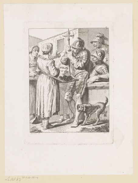 Johann Georg Wille created this print, 'Soldaat gezeten aan een tafel,' meaning 'Soldier sitting at a table,' with etching. The soldier’s relaxed posture belies the latent power of the sword, a symbol of authority, and perhaps a looming threat in times of conflict. The sword is not merely a weapon; it is a potent symbol, seen across centuries and cultures. Consider the ancient Roman gladius or the medieval knight’s broadsword, each a scepter of power. Even in repose, the sword carries the weight of potential violence and control. The soldier’s casual demeanor, contrasted with the sword, hints at a psychological ambivalence—a man at ease yet armed, suggesting a society ever-ready for conflict. This dichotomy reflects a deep, primal tension, rooted in our collective memory of survival and dominance, echoed in various cultural and historical contexts. The image evokes a sense of cyclical history—the recurrence of conflict and the enduring symbols of power.