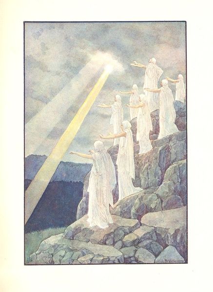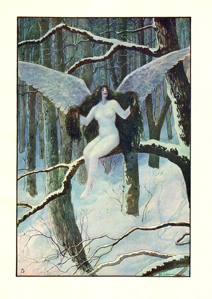 Curator: We’re looking at a watercolor illustration, "Illustration for Božena Němcová's Fairy Tales" by Artuš Scheiner. Editor: My first thought is, what an ethereal, dreamlike image. The palette is muted, soft—mostly blues, greens, and lavenders—it creates a mood of hushed reverence. Curator: Indeed. Scheiner's use of watercolor is fascinating here. Look how he layers the washes to achieve depth, particularly in the angel's wings. The way the light seems to emanate from the figure suggests a careful understanding of luminosity through the manipulation of materials. It moves away from clear lines between artistic creation and practical craft. Editor: And the figure of the angel, bathed in light, certainly stands out. Note the traditional symbolism: the wings representing spiritual elevation and divine messenger status. Consider how this imagery resonated within the cultural context of the fairy tale tradition—angles representing purity and hope. Curator: Beyond just symbol though, I am really taken by the process of how watercolor behaves in Scheiner's hands. The lack of distinct hard lines could be less about stylistic intent, but could reflect a more collaborative effort between the artist's intention and the material itself. Editor: But don't overlook the emotional impact! The fairy tales would bring in common folklore archetypes as carriers of deeper cultural anxieties and wish fulfillments. So to make this for a younger audience brings up complex traditions for moral or ethical teachings. Curator: What intrigues me about the image is the balance. We have the detailed rendering of the supplicant figure in ornate costume placed against the almost abstract rendering of nature. We see class expressed in his clothing materials juxtaposed with more simplistic materials from nature in the illustration itself. Editor: Overall, this is about using images as vehicles for cultural memory and deeper meanings. Scheiner's work seems steeped in symbolic representation of angels in popular traditions. Curator: Perhaps this reminds us how much an artist depends on raw material. The paper texture, how Scheiner's pigments bind and settle – those actions equally sculpt this memorable scene. Editor: A magical glimpse into a world where earthly concerns and ethereal hopes meet. Curator: A perfect reminder about considering both the material and emotional layers behind these fairytale tellings.