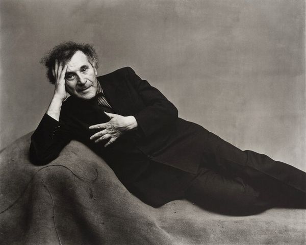 Curator: Here we have Robert Mapplethorpe's photograph of Roy Lichtenstein. The print measures approximately 61 x 51 centimeters and is part of the Tate Collection. Editor: The composition strikes me immediately – the soft focus on Lichtenstein's face, set against one of his own bold paintings in the background. It is an interesting contrast in textures and moods. Curator: Mapplethorpe often challenged notions of beauty and art production. He uses the photographic medium here to capture Lichtenstein in a very classic, almost portrait-like pose, yet it's framed by one of his own pop artworks. Editor: And in doing so he is underscoring the context and the commercial art world that shaped Lichtenstein's career, bringing focus to his craft and labor by putting his face in front of the work. Curator: Precisely, and by choosing to photograph a fellow artist, Mapplethorpe inserts himself and his artistic choices into the larger narrative of 20th-century art. Editor: It is also about the image, isn't it? The politics of creating iconic images, whether through painting or photography, both artists engage with that. Curator: Well put. It gives you a lot to think about in terms of artistic legacy, doesn't it? Editor: Absolutely, it’s much richer now knowing more about their intentions.