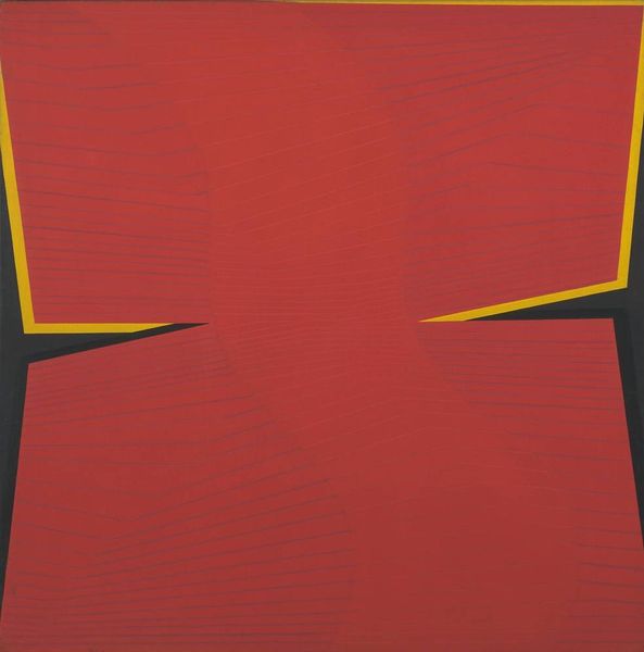 Curator: Welcome. We are standing before "Espaces intérieurs," an acrylic on canvas piece completed in 1989 by Charles Bezie. Editor: The immediate impact is of constrained energy. The composition is assertive in its geometry yet also feels somewhat melancholic—almost like a cityscape shrouded in twilight. Curator: That perception resonates. We see precisely delineated planes of dark gray offset by stark vermillion bars. The employment of hard-edge painting, typical of its art movement, produces an austere, yet curiously animated spatial dialogue. Editor: Animated is right! It feels like there’s a secret code here—or the blueprints for a really cool, minimalist fort. Do you think that restricted palette forces your attention to the structural dynamics at play? Curator: Undeniably. The color palette simplifies the visual field, obligating a meticulous reading of form, direction, and relative placement. The contrasting acute angles and perpendicular lines suggest tension within equilibrium, demanding introspection. Editor: Introspection... exactly! It has that air of detached observation—as if the artwork itself is contemplating some grand internal mechanism. Makes me wonder what "interior spaces" Bezie had in mind, his or someone else’s? Curator: That interpretive openness contributes significantly to its appeal. Bezie's skillful manipulation of geometric abstraction encourages an ongoing aesthetic debate—an invitation to excavate subjective relevance in its structured silence. Editor: Structured silence – I love that! You know, spending even this short amount of time with “Espaces intérieurs" has changed how I look at it, shifted its meaning for me. Now I see it not as melancholy, but almost...hopeful. Curator: Indeed, these planes are surfaces and these bold colors might reveal inner spaces. Editor: I think you're right; it invites a reconsideration of depth, literally and figuratively.