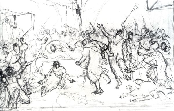 Editor: We're looking at "On the Terrace. Figure composition with four women." by Othon Friesz, created sometime between 1879 and 1949. It’s a drawing from the SMK – the National Gallery of Denmark. It’s pretty sketchy, almost like a first draft. What do you make of it? Curator: The power here resides in its very incompletion. Note how the stark, rapid lines carve out forms from the white background. Consider the dynamism achieved with so few strokes. It emphasizes pure form rather than attempting representation. It is almost an exercise in semiotics – what minimum signals do we need to interpret figuration? Editor: It is interesting how the lines are so spare but the figures are definitely there. So the figures are almost symbols then? Curator: Precisely. Now consider the landscape suggested in the background. Are we truly concerned with geographical specificity, or are we more interested in the visual contrast, the push and pull between near and far suggested by varied line weight? Is this drawing about figures or their relationship to form itself? Editor: It’s interesting that you focus so much on the lines. I would never think that looking at a landscape! Curator: The landscape is a scaffolding upon which to play with those structural considerations, line, depth, contrast. We must acknowledge its importance, but always keep coming back to the fundamental structure of the art. What have we gained by reducing such a scene into near abstraction? What’s amplified? Editor: That makes me see how looking at it less literally almost opens it up. I notice the foreground and background more distinctly now because of how minimal everything is. Curator: And in so doing, the material of art– the application of line–becomes, ironically, the core content itself.