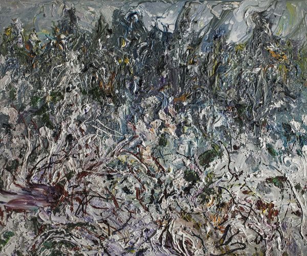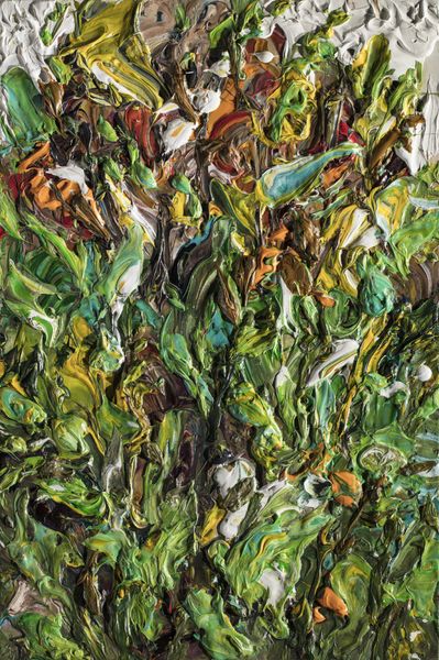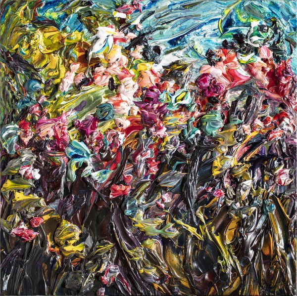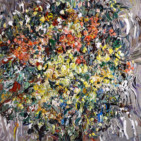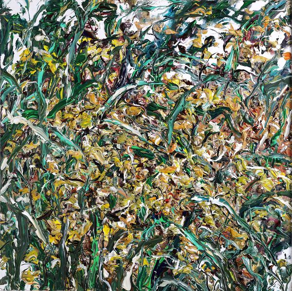 Curator: Well, I am immediately drawn to the texture here! This impasto technique creates a relief-like surface. It's practically sculptural. Editor: Agreed. There's a real sense of energy there. And it certainly grabs your attention, doesn’t it? I’d call this quite an immersive expressionistic landscape. Before we delve in too deep though, let’s give our listeners some context. This piece is "\u7eff\u8272\u6742\u8349", or "Green Weeds," created by the artist \u738b\u65b0\u798f in 2020, using acrylic paint. Curator: Acrylics lend themselves nicely to this kind of thickly applied impasto; allowing the artist to build up substantial layers quite quickly, something we would not find in oil based matter-painting for instance. It challenges the traditional smooth surfaces we often see and elevates the inherent materiality of painting itself. Editor: I see it fitting within a larger trajectory, where painting departs from simply representing the world to becoming an event in itself. The deliberate build-up of paint acts, in effect, as an historical document of its creation; it is now, as much as a field is itself, something happening in a very specific moment in space and time. Curator: The social context comes into play too. It challenges traditional notions of art consumption by placing value on the labor and physical presence of the artist. Viewers are forced to engage with the tactile nature of paint, thus acknowledging the skill and craft involved. Editor: Absolutely, the physicality here, and its prominent presentation within a gallery space challenges our preconceived notions. It moves matter-painting from the edges of contemporary art to becoming its very subject matter, while simultaneously nodding to a familiar history of mark-making. Curator: It's this conscious engagement with material, pushing against boundaries, that makes it a fascinating piece. I am interested to know what direction the artist may head towards. Editor: Indeed, seeing "Green Weeds" in the gallery causes me to really reassess those material dialogues you brought up. It pushes matter-painting somewhere that both the artist and I did not initially intend, in the very best sense.
