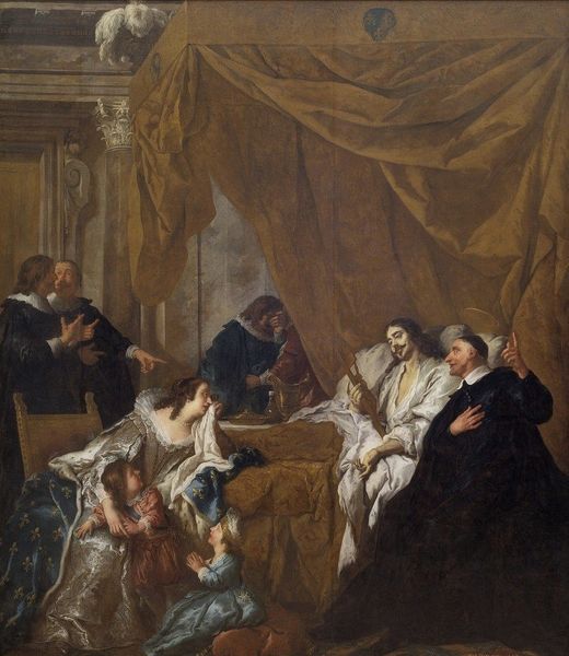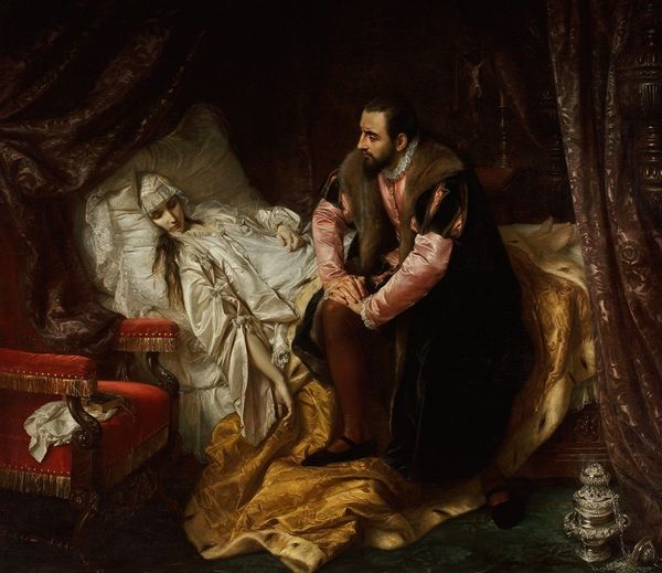 Edmund Blair Leighton painted "Witness my act and seal" during an era fascinated by idealized historical narratives. Leighton, working in late 19th and early 20th century England, found popularity creating romanticized scenes from the medieval and early modern periods, an aesthetic rooted in the Pre-Raphaelite movement. Here, Leighton depicts a tense moment, likely a deathbed scene. The emotional core of the painting lies in the faces of the figures present. Each embodies a distinct role and response, the somber doctor checking the ailing man's pulse, while the fair lady appears to be looking off in the distance. The maid stands in the background, passively awaiting instruction. In Leighton's world, the past is re-imagined through a lens of Victorian sentimentality, and it certainly reflects the era's rigid social structure. The details in clothing and setting serve to create a sense of nostalgia for a time of chivalry and romance, yet one must question the identities and stories left untold in such representations.