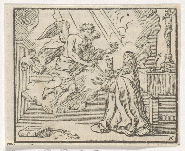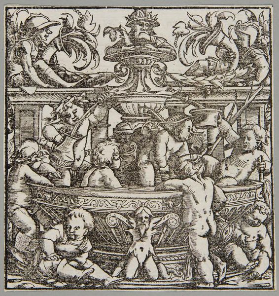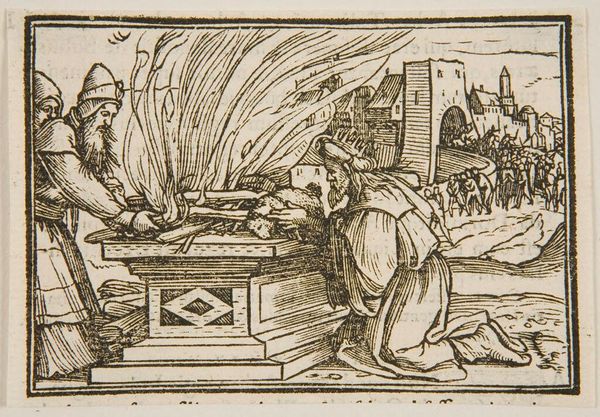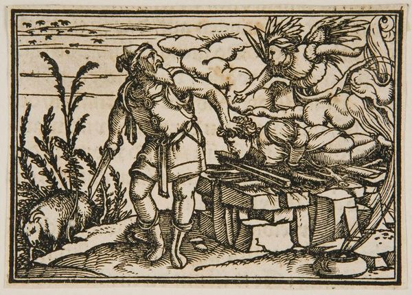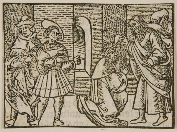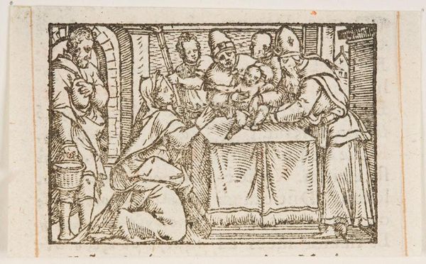 Curator: Here we have an intriguing woodcut titled Genesis 50: Joseph's Father's Burial, created by an anonymous artist. Editor: The stark black and white really emphasizes the solemnity of the scene, doesn't it? A real somber mood from the cross-hatching. Curator: Absolutely. Notice how the ritualized gestures of lowering the body into the tomb speak to ancient burial rites and beliefs about the afterlife. Editor: I'm struck by how the artist rendered the textures, especially on the rock face. It makes me think of the labor involved in carving both the block and the tomb itself. Curator: That is interesting. The image reminds us of the enduring power of visual symbols to convey cultural memory. Editor: It does highlight the value and labor involved in both art production and ancient traditions. Curator: Indeed, both in life and in art.