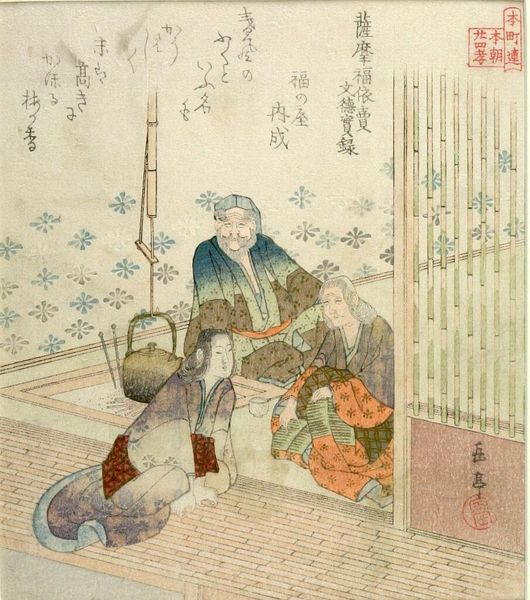 Curator: Yashima Gakutei's print, “Filial Son in Shinano,” from the series Twenty-Four Japanese Paragons of Filial Piety, presents us with a tender scene. It's printed on paper, fairly small, but feels intimate, don't you think? Editor: Intimate is the word! I'm immediately drawn to the man's focused expression, almost severe, yet there's a sense of duty, of profound respect embedded in that furrowed brow. Curator: Absolutely. The act of filial piety itself, a cornerstone of Confucian ethics, is visualized here. The garments, the poems alongside the image, they all speak to societal values. Editor: Indeed! The sword adds a layer of complexity. Is it just a symbol of status, or does it hint at a more complex dynamic between father and son, perhaps unspoken expectations? It grounds the image. Curator: It's a fascinating tension, that blend of cultural ideal and individual experience. The poems are such interesting additions to the image itself. They add to that. Editor: It really does invite reflection on the weight of tradition and the quiet power of devotion, doesn't it? Curator: Precisely. Gakutei, through these visual symbols, prompts us to ponder on generational connections.