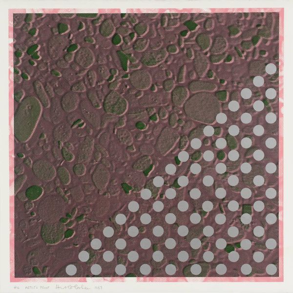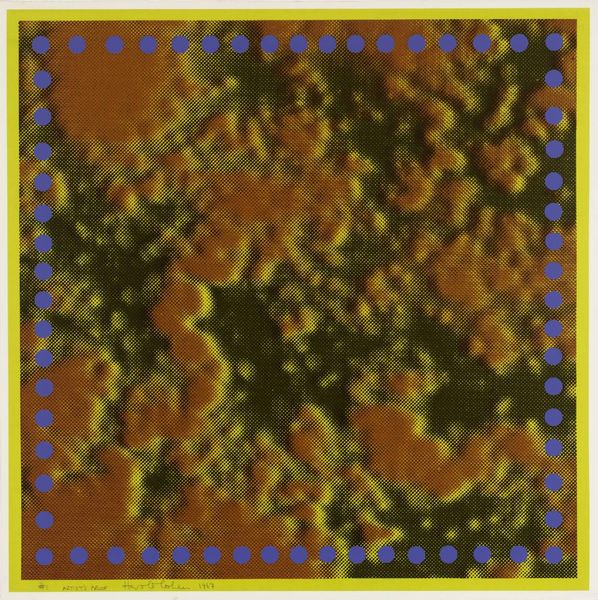 Curator: This is Harold Cohen's "Derrynan IV" from the Tate Collections. The dimensions of the image are 638 by 638 mm. Editor: It looks like some strange topography meets a screen printing experiment. It almost feels digital, but with a very earthly palette. Curator: Cohen was deeply interested in systems and how art could be generated through rules. He used early computer programs to create art, questioning the traditional role of the artist. Editor: Interesting. The circles, arranged like rising bubbles, feel like a direct contrast to the chaotic forms above. Are they supposed to be read as a symbol? Curator: Perhaps of order imposed onto the organic? It's fascinating how he uses printmaking techniques to mimic both the irregular textures and the stark geometry. It challenges what we consider 'high' art versus a manufactured object. Editor: I see a kind of symbolic dance here between nature and artifice. The earthy tones mixed with the precise circles create a tension—a feeling of control versus wildness. It reminds me that images are never neutral; they always carry meaning. Curator: Indeed. And thinking about the materials, the ink, the paper, the printing process itself, it's all part of the message. Cohen pushes us to consider art making as a form of labor and production. Editor: Well, I'll certainly be thinking about the language of symbols and systems for a while after this. Curator: And I'm pondering the very nature of making and artistic intent.