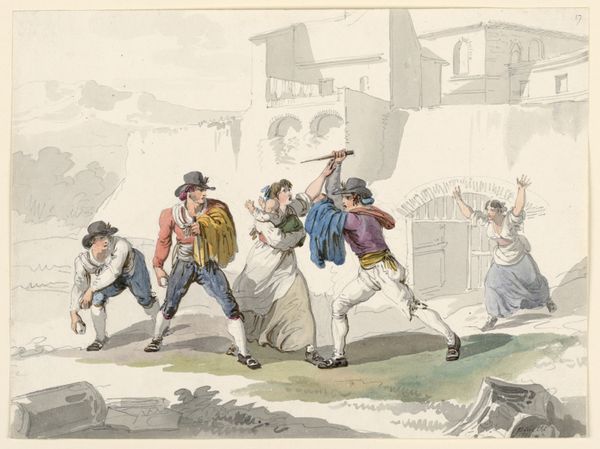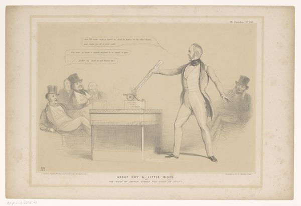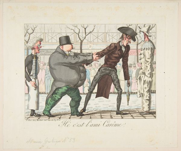 Alfred E. Baker made this hand colored lithograph, "Vive la France, Balancier, Both in "Tow"", sometime in the 19th century. The pale hues and meticulous draftsmanship lend the scene a delicate, almost dreamlike quality. A central figure, caught mid-motion playing battledore, commands attention and arranges the spatial dynamics of the image. The composition is structured around contrasts: action versus repose, male versus female, foreground versus background. These binary relationships suggest a deeper structural interplay—perhaps a commentary on social roles and performative identities. The caricatured figures introduce an element of destabilization, challenging conventional notions of beauty and decorum. Note how the artist toys with semiotics of dress and gesture. The subtle use of color, the meticulous linework, and the balanced arrangement of figures all contribute to a composition that invites us to consider the underlying codes and conventions that shape our perceptions. As you engage with this print, reflect on how its visual structure prompts us to question fixed meanings and engage in a continuous process of re-interpretation.