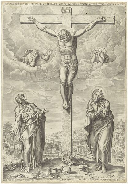 Curator: Here we have a Baroque engraving, "Kruisiging van Christus, middendeel"—or, "Crucifixion of Christ, center panel"—created sometime between 1590 and 1632 by Pieter de Jode I. It's part of the Rijksmuseum's collection. The detail is remarkable. What are your first impressions? Editor: Intensely melancholic. The stark contrast of the black ink on paper amplifies the feeling of desolation. It's like looking at a memory, a haunting echo of immense suffering. Curator: Exactly. De Jode's choice of the engraving medium, with its precise lines, gives a meticulous rendering of the scene, almost forensic. But it's not just about the physical suffering, is it? There's so much symbolism layered in. Editor: Absolutely. We can see the religious historical context and how the act of salvation connects to the figure in the middle of the artwork. Beyond that, there's the depiction of women as these grieving witnesses, embodying a particular kind of sorrow and empathy historically projected onto them, and which demands more introspection. Curator: I agree. And look at the city in the background – almost a dreamscape, compared to the very immediate anguish in the foreground. It makes you wonder about the wider implications of what is unfolding. The chaos on earth and harmony promised in afterlife. Editor: And, let's consider the almost propagandistic function of such images in that era. This wasn't just art, it was a tool for the Church, visually reinforcing religious narratives but also a statement of power through the narrative's reach and emotional manipulation. Curator: The work becomes a powerful example of the Baroque style, doesn’t it? Emphasizing emotional impact, dynamic composition, even a sense of theatrical drama, to convey its message. Editor: In today's climate of political and social turbulence, and with religious extremism on the rise, such pieces remind us how important it is to separate compassion and justice from harmful ideologies. Curator: Precisely. It seems like a crucial and lasting legacy that this artwork, along with similar ones of that age, keep provoking a very valuable historical revision of events, places and figures. Editor: Indeed. Viewing it through a lens of awareness—historical, social, emotional—lets us engage in something profound, transcending centuries.