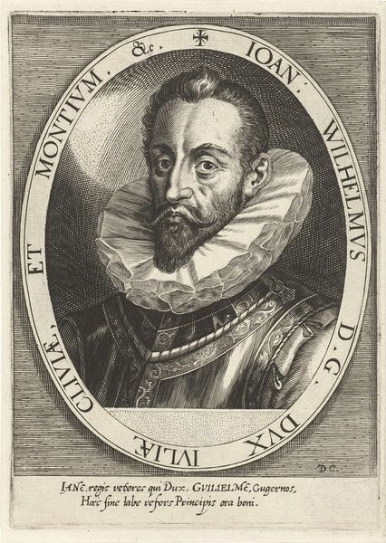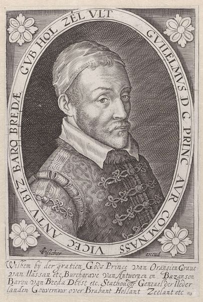 Curator: The work before us is an engraving, dating from between 1590 and 1611, titled "Portret van Nicolaus Pálffy, baron van Erdőd" and is attributed to Hans Sibmacher. Editor: It strikes me as an image imbued with power. The baron's steady gaze and the trappings of his office, particularly that intricately rendered helmet, really give the impression of a man of authority and action. Curator: Indeed. Let's consider the engraving itself. The labor involved in creating such detailed lines with the burin, cutting into a copper plate… The consumption of materials in ink and paper, allowing for multiples to be printed and circulated—these all point to its accessibility to a broader audience than a painted portrait would have reached. Editor: The helmet is held almost as an emblem of honor, doesn’t it? Its presence tells a story of a warrior, or at least a commander; it signifies a martial tradition, heroism, and possibly sacrifice. The fur trim on his garment also denotes wealth, social standing, and power through consumption, in your terms. Curator: Precisely. The availability of materials is equally important here, with that sumptuous fur coming from further afield to show authority, even down to the precise cuts of the armor he would wear into battle. Editor: Beyond status symbols, this imagery connects with cultural ideals. Consider how this man wanted to be seen—a strong, honorable leader worthy of respect. Even the Latin inscription serves to enshrine his legacy in historical memory. Curator: And by reproducing this image, his power is spread, the machinery of his presence is amplified. It all goes to his material being and his ability to dominate those materials and images of himself, his influence is secured through accessibility to these works. Editor: It's intriguing how these combined elements create an individual of both substance and image. This speaks to more than just individual importance; the subject participates in this construction. Curator: It is quite illuminating to view Pálffy’s portrait not only as a depiction of status and strength, but as an artifact embedded within historical flows of labor, materials, and distribution. Editor: Looking closer into the image, thinking about how historical context shaped the symbolic elements we perceive, it opens new avenues for appreciating the complexities inherent in art like this.