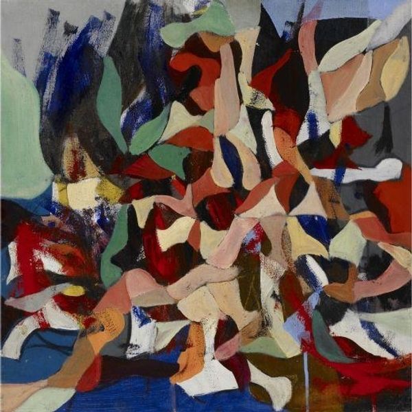 Curator: We are looking at “Flori” by Ion Pacea, an expressionist acrylic painting of flowers that embraces neo and abstract expressionist styles. Editor: My first thought is, explosive. It's like a floral bouquet got caught in a wind tunnel, and the colors, oh, they’re a riot, but in a strangely pleasing way! Curator: Exactly! The bold brushstrokes are quite typical of expressionism as a way to communicate the inner state of the artist rather than portraying the external appearance. And considering expressionism, it emerged from a cultural context of deep anxiety about modernity. Editor: That resonates. The impasto is incredibly thick; you can almost feel the texture. It's as if the artist were wrestling with the medium, grappling with something unspoken while building these shapes. Each stroke feels like a separate, urgent decision. Curator: That reminds me of matter-painting. The themes related to it embrace this almost aggressive physical engagement with the paint as an end in itself. Now, Romanian art was in a pretty tough spot, in general, by the middle of the 20th century under the communist regime. Art that stepped out of line faced heavy critique or worse. So maybe the "explosive" quality is not just an artistic choice but also reflects that. Editor: Oh, wow, that shifts things, doesn't it? The dark teal background feels almost like a veil of secrecy now. It’s interesting how these "safe" subject matters, such as flower painting, can be containers for hidden rebellious thoughts, and a place where it is actually expressed as a material thing, like what you say. Curator: Precisely! This might explain why it can only be understood as expressionist in retrospect. This painting definitely proves that art doesn't exist in a vacuum; social circumstances and personal stories feed into its meaning. Editor: It is like the silent screams. And I find it fascinating how, despite what seems to be, let's say, visual chaos, there's something quite structured underneath. As if it hints that freedom actually arises out of restrictions and a strong need of communicating things! Well, that gives the piece a unique kind of strength, actually! Curator: Indeed. A lot to unpack! I find it fascinating how our different points of view contribute to seeing an artwork's different, equally real facets. Editor: Me too. You helped me realize that my guts, are historical ones.