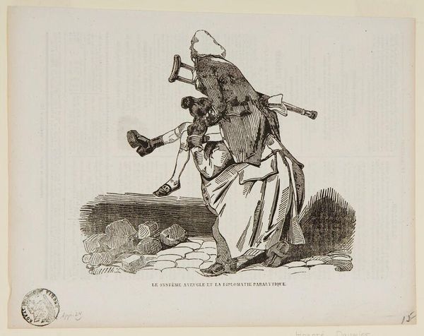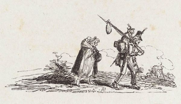 Editor: This sketch by an artist from the British School depicts a street scene, seemingly chaotic. I'm struck by the use of line to create a sense of movement and disarray. What compositional elements stand out to you? Curator: The dynamism achieved through the artist's energetic linework is indeed compelling. Note how the diagonal lines, particularly in the figure wielding the staff, create a sense of forward momentum, contrasting with the static verticality of the lamppost. Editor: I see what you mean. It's almost like a snapshot of a fleeting moment. Is there a hierarchy in the composition or does each figure share the same importance? Curator: The slumped figure in the foreground, framed by the converging lines of the pavement, occupies a dominant position. The artist's skillful use of perspective draws the eye towards this central point of apparent vulnerability, but it is hard to ignore the violence suggested by the other figures. Editor: That's a perspective I hadn't considered. I was too focused on the action of the image. Curator: Sometimes focusing on the intrinsic visual aspects alone can reveal deeper meanings. Editor: This has been a really enlightening experience; I'm already looking at the artwork differently.