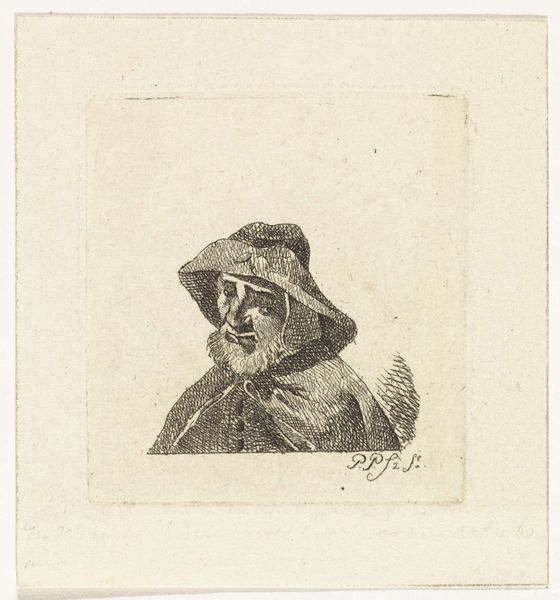Curator: Welcome. Today, we're looking at "Buste van vrouw met muts," or "Bust of a Woman with a Cap," an etching created sometime between 1840 and 1876 by Jan Bikkers. Editor: The first thing that strikes me is the woman's intense gaze. It feels like a study in quiet strength or even resignation. And the use of line creates such a dramatic sense of shadow, deepening that mood. Curator: It’s intriguing how Bikkers, likely drawing from or referencing earlier medieval styles, employs etching—a technique readily lending itself to the distribution of images within a certain socio-political climate—to perhaps portray an allegorical figure? Given the revival of medievalism throughout Europe at this time, one could also consider this artwork from a post-enlightenment philosophical framework. Editor: An allegory perhaps of female experience or resilience under duress, given her heavy clothing and the somber light, or are you talking about power dynamics? There’s something quietly radical, a subversion, in giving such presence to a perhaps otherwise overlooked individual through figuration. Is she meant to represent a demographic of people? Curator: I think you've pinpointed something essential about representation. The fact that Bikkers, working during a period of intense social change, chose to portray a woman who's simultaneously cloaked and revealed raises compelling questions. How does the very act of looking, of creating this image, engage with the viewer's expectations of gender and power? We need to also ask ourselves how this fits into broader narratives of national identity and the way cultural institutions participated. Editor: Absolutely. It’s like the artist is presenting the woman not as some pre-conceived, aestheticized, ornamental representation, but challenging our understanding of medievalism itself in relation to contemporary views about gender. The directness in her gaze demands some kind of interaction from the viewer, to engage with the subject. The social and cultural significance really does become apparent under consideration, even though its physical presence might seem insignificant as a printed medium. Curator: Exactly. We often discuss the grand narratives of art history, but it’s in these more intimate and seemingly simple works that we find a reflection of a society grappling with evolving ideas and social change. It brings to the forefront how art becomes a public forum to engage in the politics of visual imagery and question historical tropes about identity. Editor: Precisely. Art invites ongoing conversation.