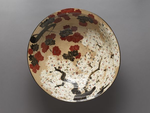 Curator: Let’s consider this Plate from between 1877 and 1893, made by Ott and Brewer. The piece is porcelain and currently held at the Metropolitan Museum of Art. Editor: My first impression is that the ornate design work gives the plate a festive, energetic feeling. Curator: Absolutely. Formally, it is fascinating to see how the orange floral patterns play against the negative space of the white porcelain. The application of gilt detailing enhances the graphic arrangement and formal qualities of the composition. How does it speak to you? Editor: For me, the interest lies in the makers’ mimicry of Asian aesthetics. This porcelain, likely made for affluent Americans, appropriates imagery associated with Asian export ware, such as birds, blossoming branches, and stylized floral arrangements. What this reveals is a desire for exoticism, reflecting a period of mass consumption, while obscuring the labor practices that enabled such mass consumption and production in a ceramic factory like Ott and Brewer. Curator: Indeed, the piece reflects Orientalism—a 19th-century fascination with appropriating and idealizing Asian cultures. The structure feels somewhat staged. A surface treatment is presented as insight; it does make you wonder, though, whether such representation of the East tells us more about the cultural moment of the West. Editor: The plate, thus, is more than just a surface. It invites us to consider what is not immediately visible, drawing our attention to the production methods, the socio-economic contexts and the politics of taste, that shaped its creation. Curator: And yet, it serves a function. It can be separated into surface design versus use, although I suspect that for pieces such as these, their worth exceeded their practicalities. I think looking at its components reveals insights into social context and manufacturing that have had lasting impacts on visual culture. Editor: Examining an everyday item like this provides insights into cultural exchange and reveals the hidden economies that shape art. I can agree with that.