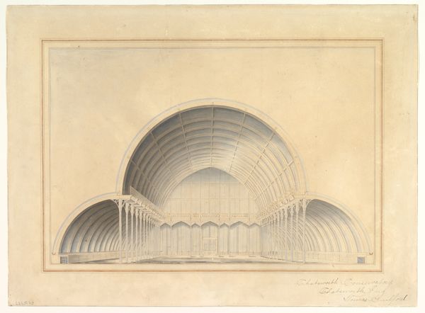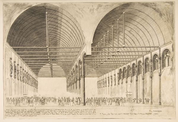 Jacques Androuet Du Cerceau rendered this drawing of the Grande Salle du Palais de Justice in Paris. The visual experience is dominated by a precise linear perspective, creating a sense of immense space. The hall's architecture, with its repeating arches and linear grid of the ceiling, evokes a feeling of structured grandeur. Du Cerceau's engraving uses the formal elements of line and perspective to create a powerful symbolic representation. The symmetrical composition and receding lines draw the viewer's eye to a vanishing point, suggesting an idealized order. The arches and windows punctuate the otherwise dominant linearity, perhaps reflecting a tension between architectural ambition and the limits of human endeavor. The drawing operates as more than a mere depiction; it presents an architectural space charged with cultural and philosophical meaning. The ordered perspective and symmetrical design invite us to consider how space is used to assert power and project a sense of enduring legacy. As such, it remains open for continual interpretation, inviting reflection on the interplay between form and ideology.
